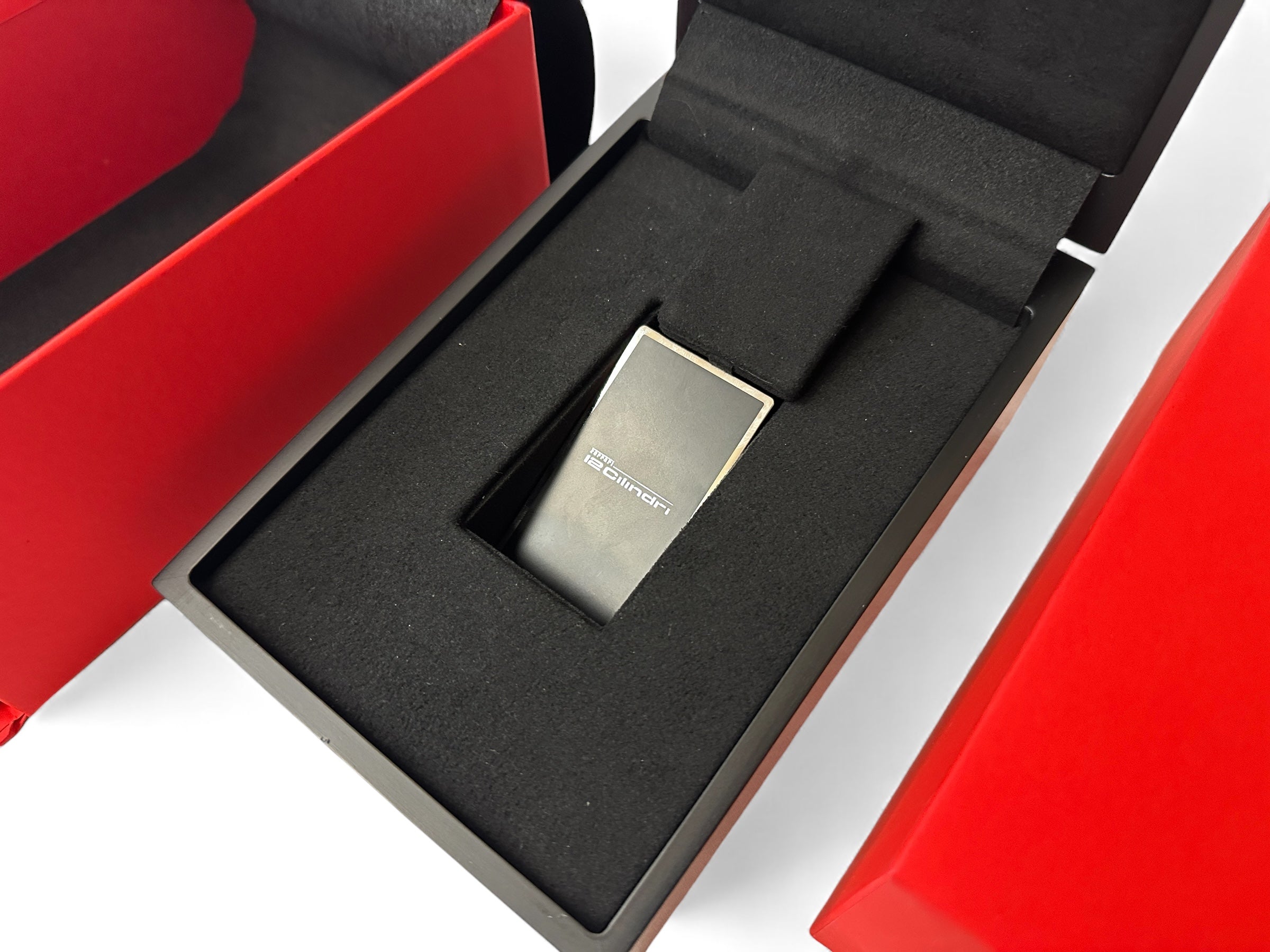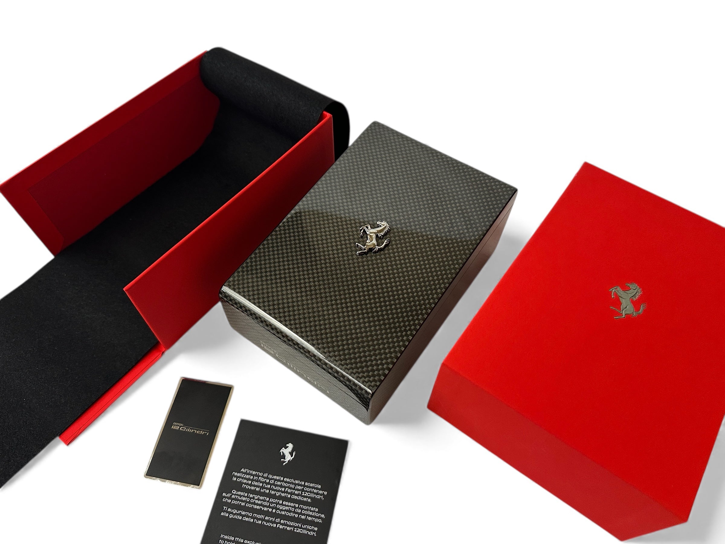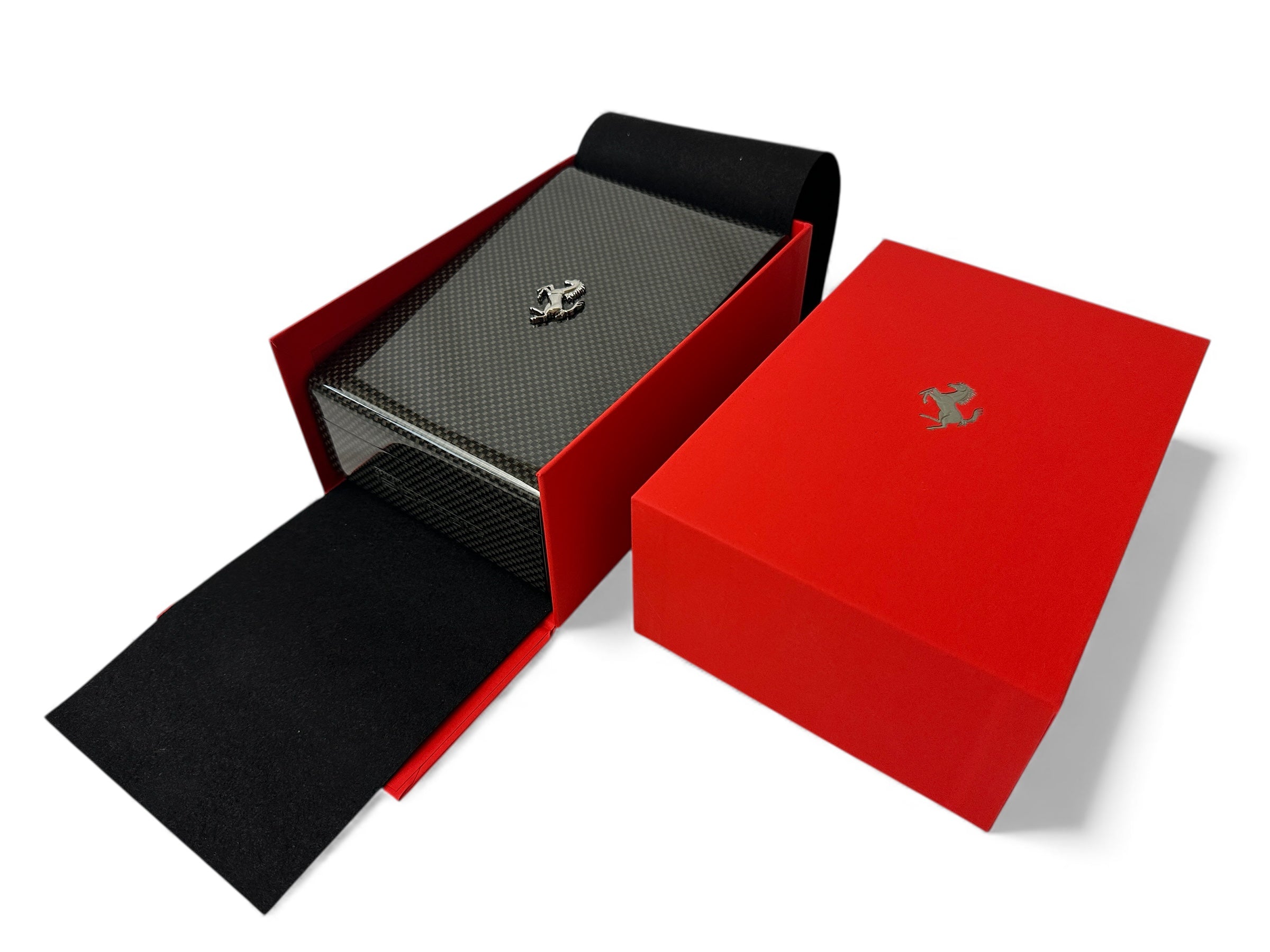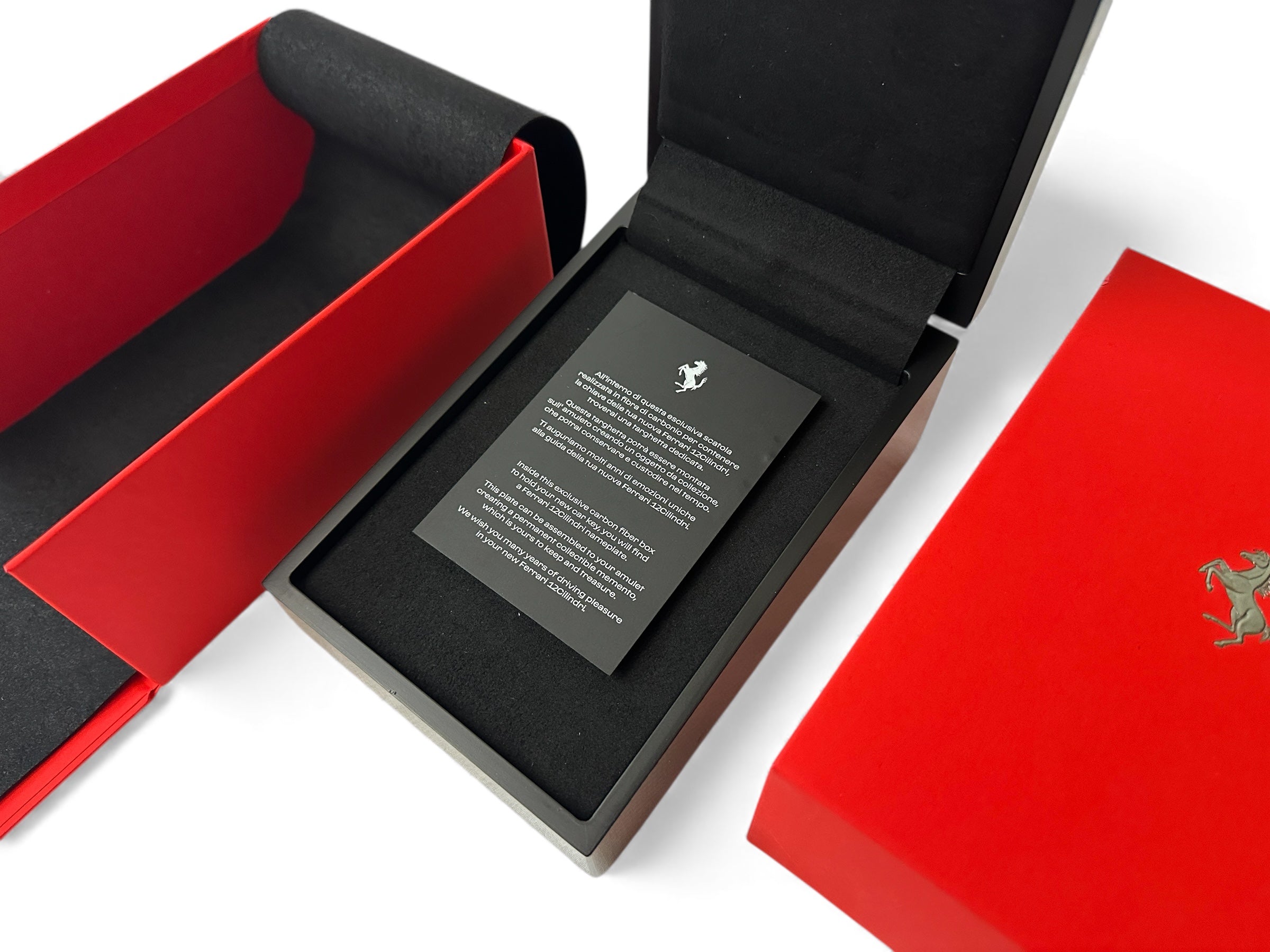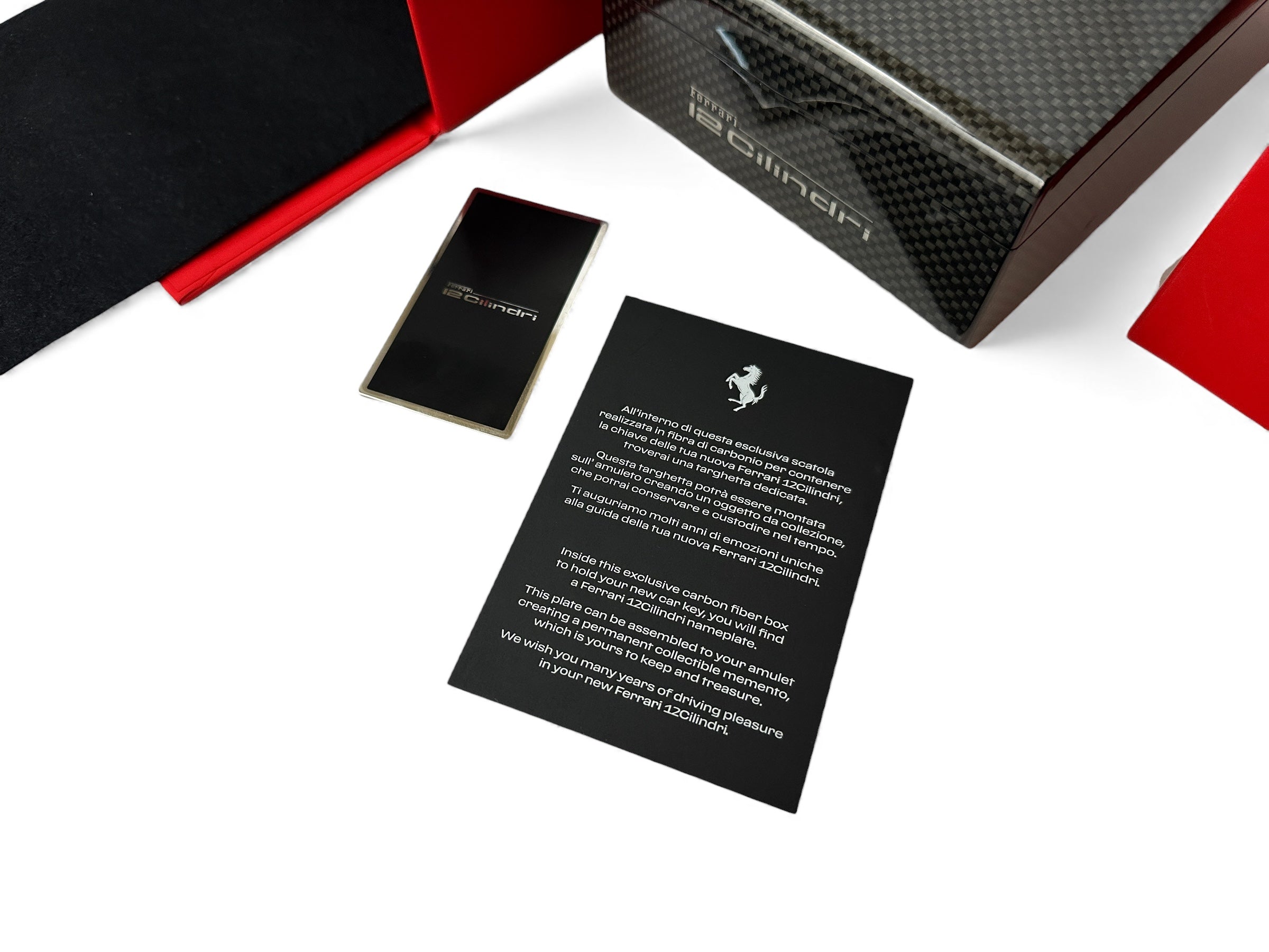 This exclusive carbon fiber key storage box t was given to first owners upon ordering a new Ferrari 12Cilidnri and was never offered for sale. It includes a high-quality carbon fiber key storage box and the official 12Cilindri nameplate designed to be attached to the vehicle’s key. A rare and refined collectable, this set represents a unique part of Ferrari’s bespoke ownership experience and is an essential item for any 12Cilindri owner or collector.