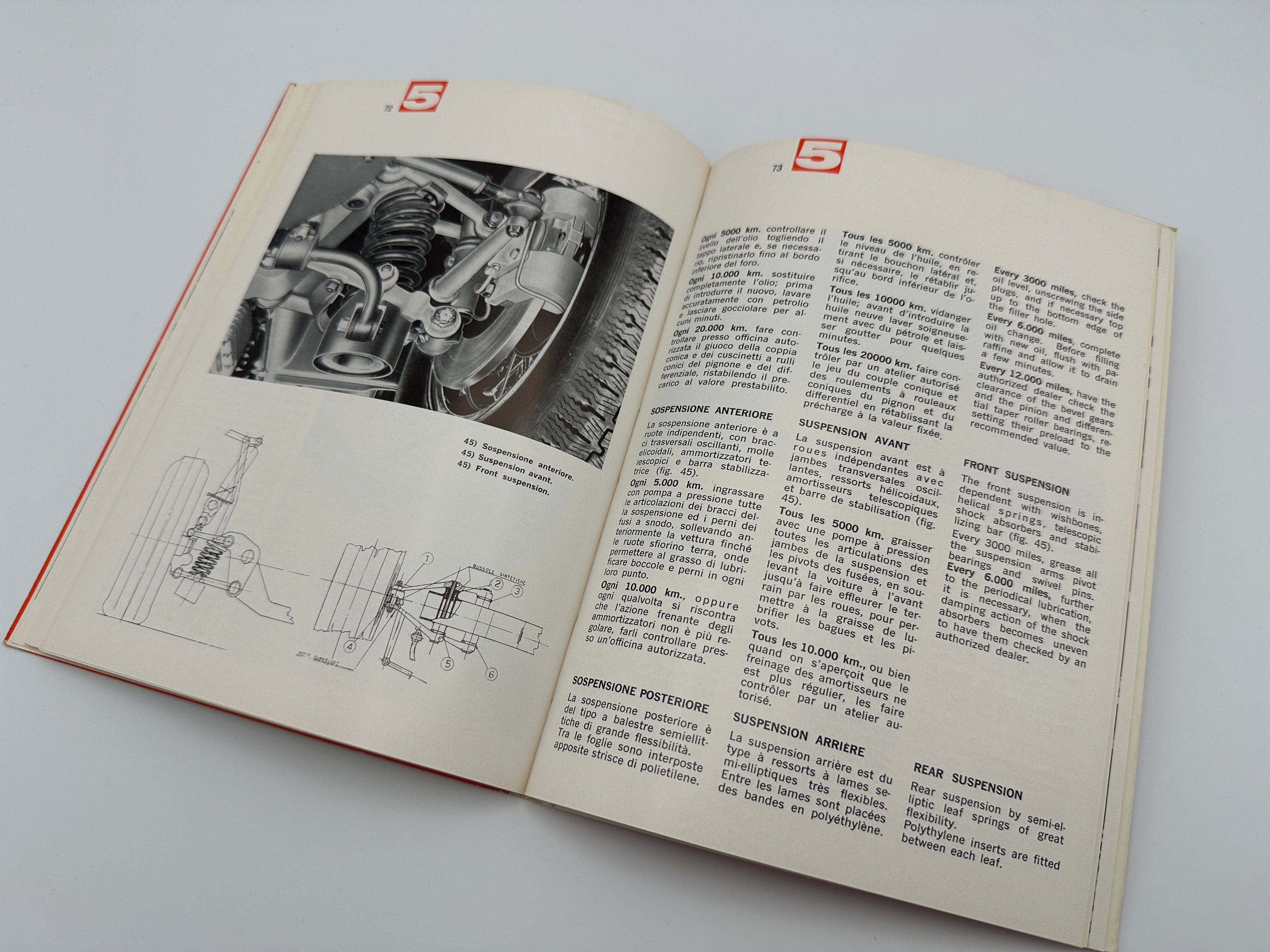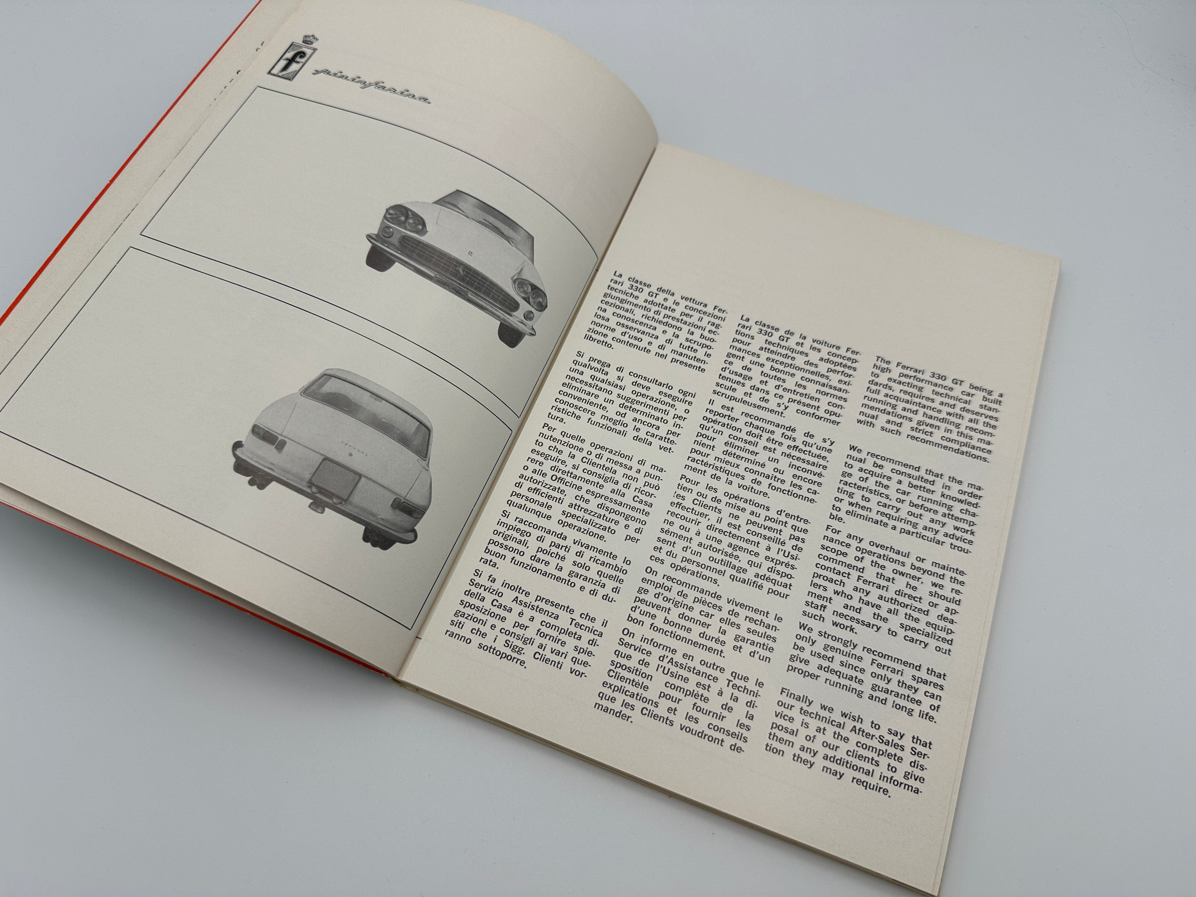 Original owners manual suitable for both Series 1 and Series 2 examples of the Ferrari 330 GT 2+2. Printed in Italy, this handbook remains in very good condition, with only slight traces of age and handling visible. All pages are intact, with no missing or loose sections.
