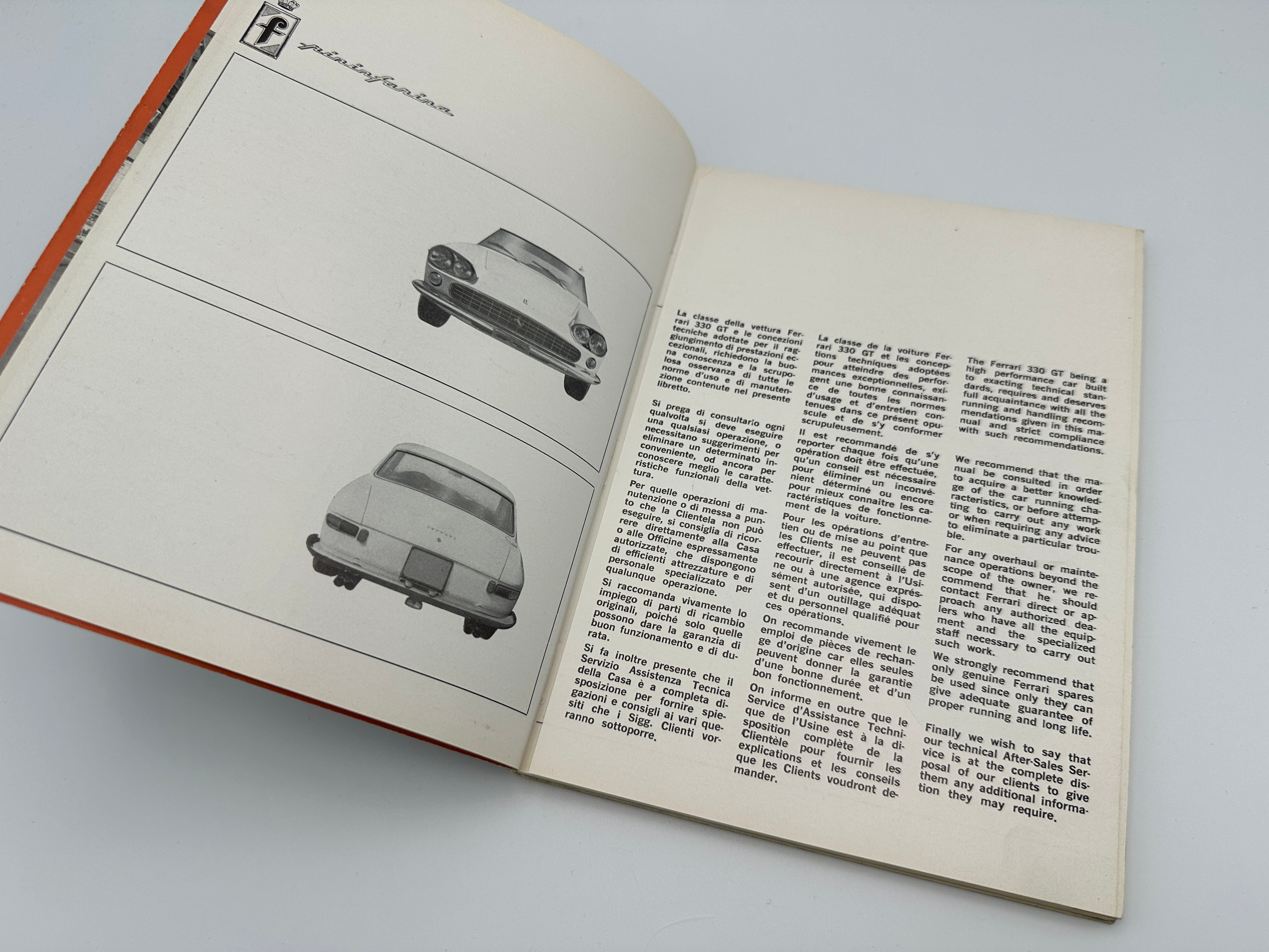 Original owners manual for the early Ferrari 330 GT 2+2 four-headlight models from the first series introduced in 1963. This rare early print edition was printed in Italy and is suitable for the earliest examples of the model. The manual survives in good condition with slight traces on the cover and no missing or loose pages. A scarce early-series document for the 330 GT 2+2.