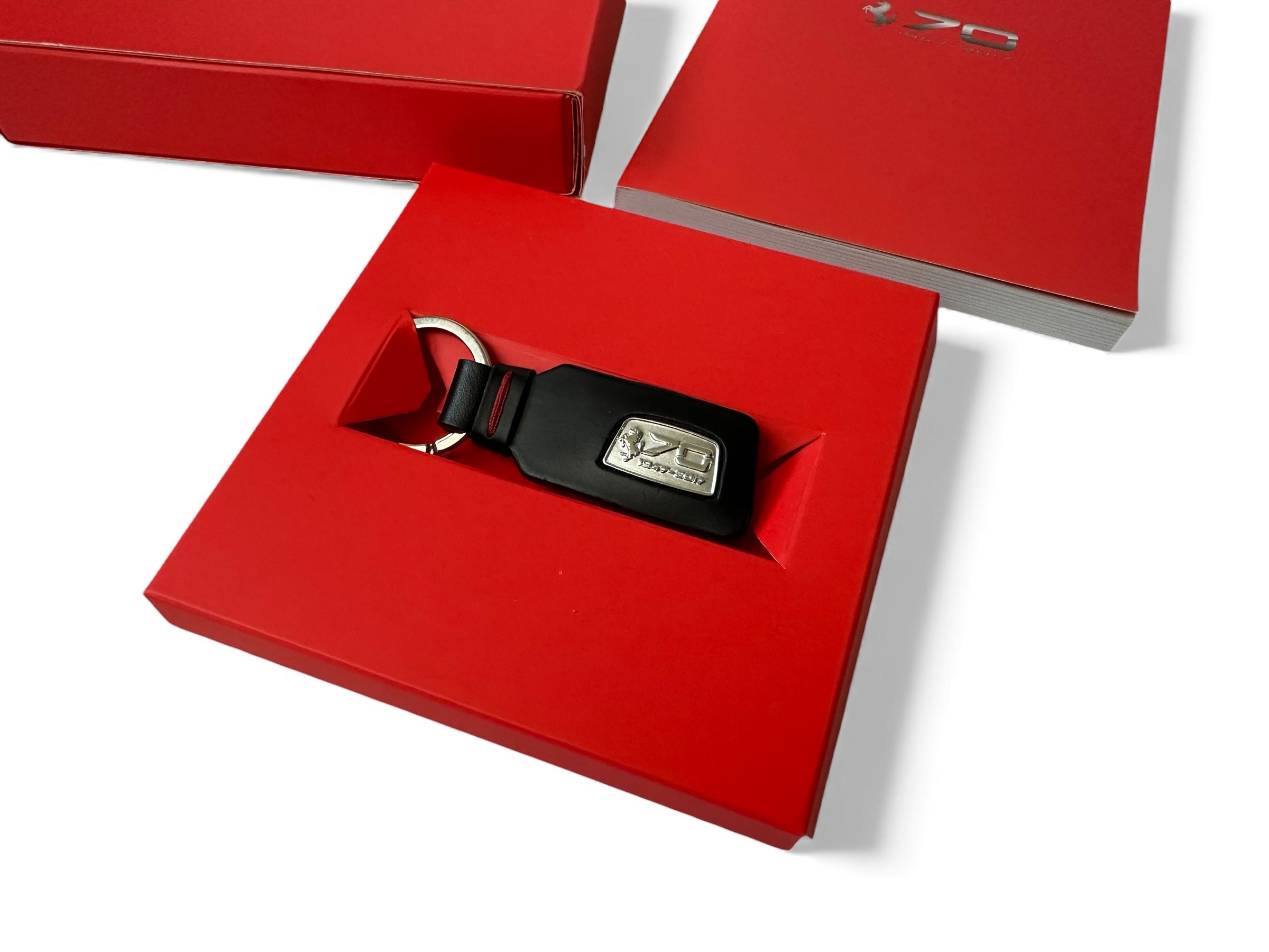 Official Ferrari leather keychain created for the 70th Anniversary celebration in 2017. This high-quality keychain comes complete with its original presentation box and a rare anniversary booklet highlighting seven decades of Ferrari history. Slight traces of handling may be visible.