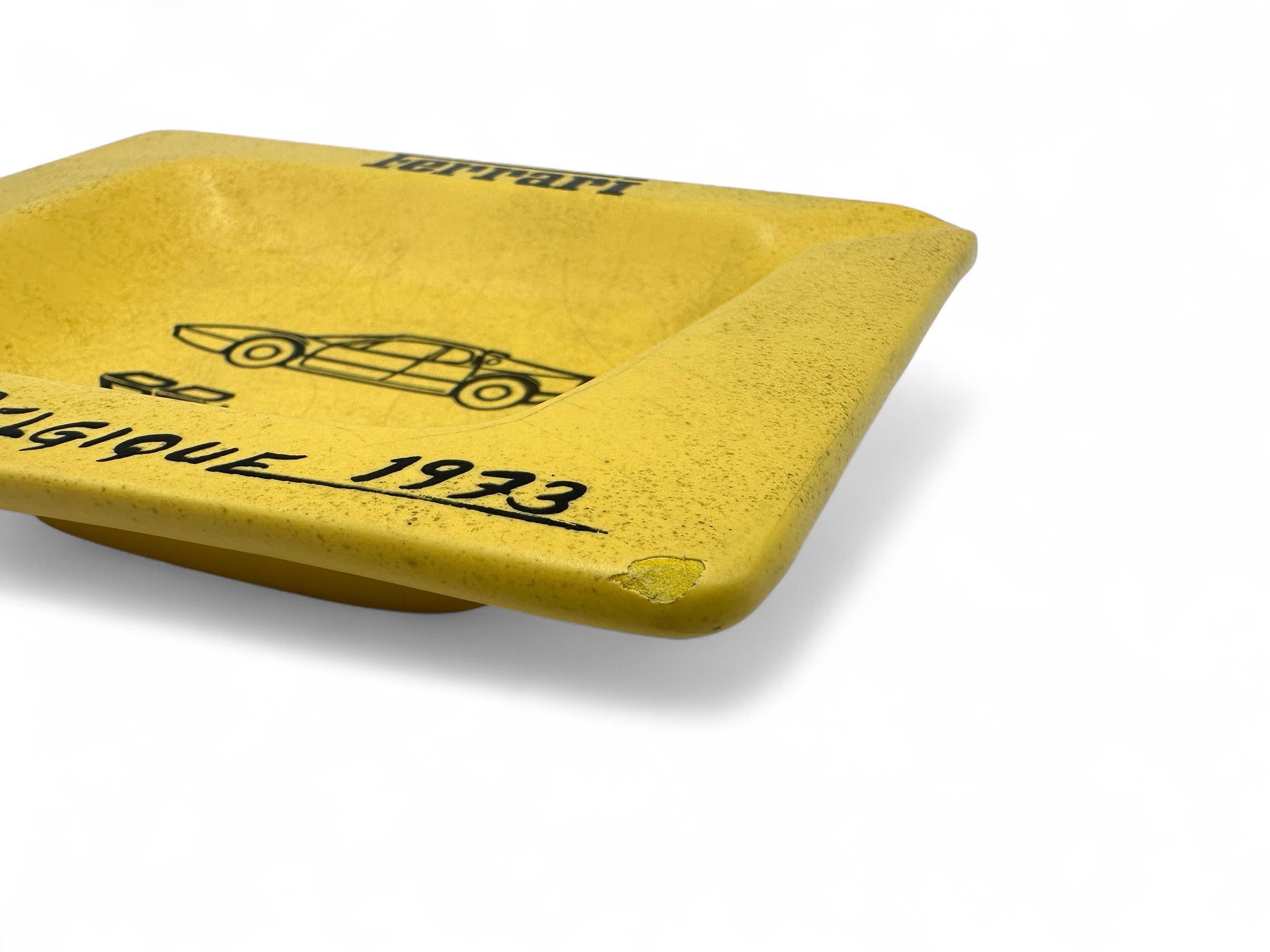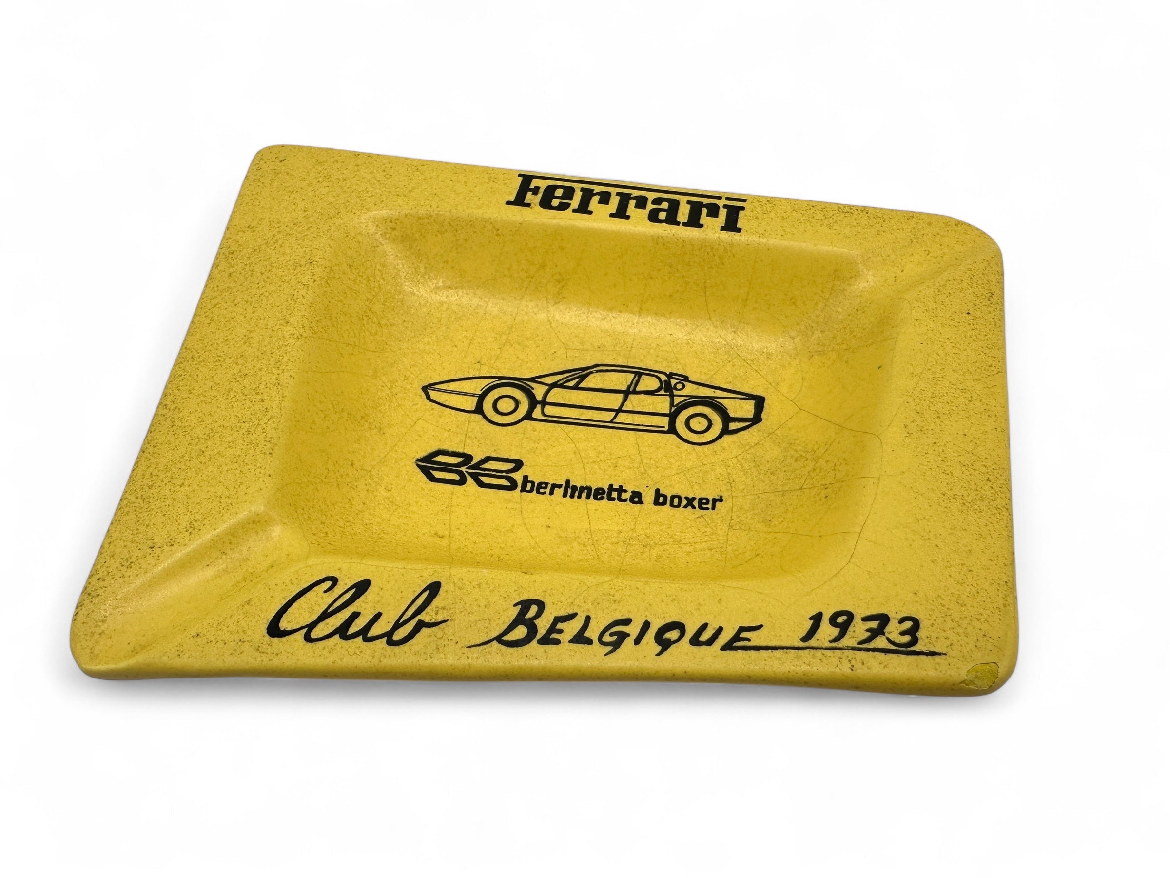 Original ceramic ashtray produced for the official Ferrari Club Belgium in 1973, featuring a detailed depiction of the Ferrari Berlinetta Boxer. Created by A. Pirini, known for producing Ferrari dealership ashtrays, this piece is finished in yellow and reflects early Ferrari club heritage—Ferrari Club Belgium being one of the oldest, founded in 1972.