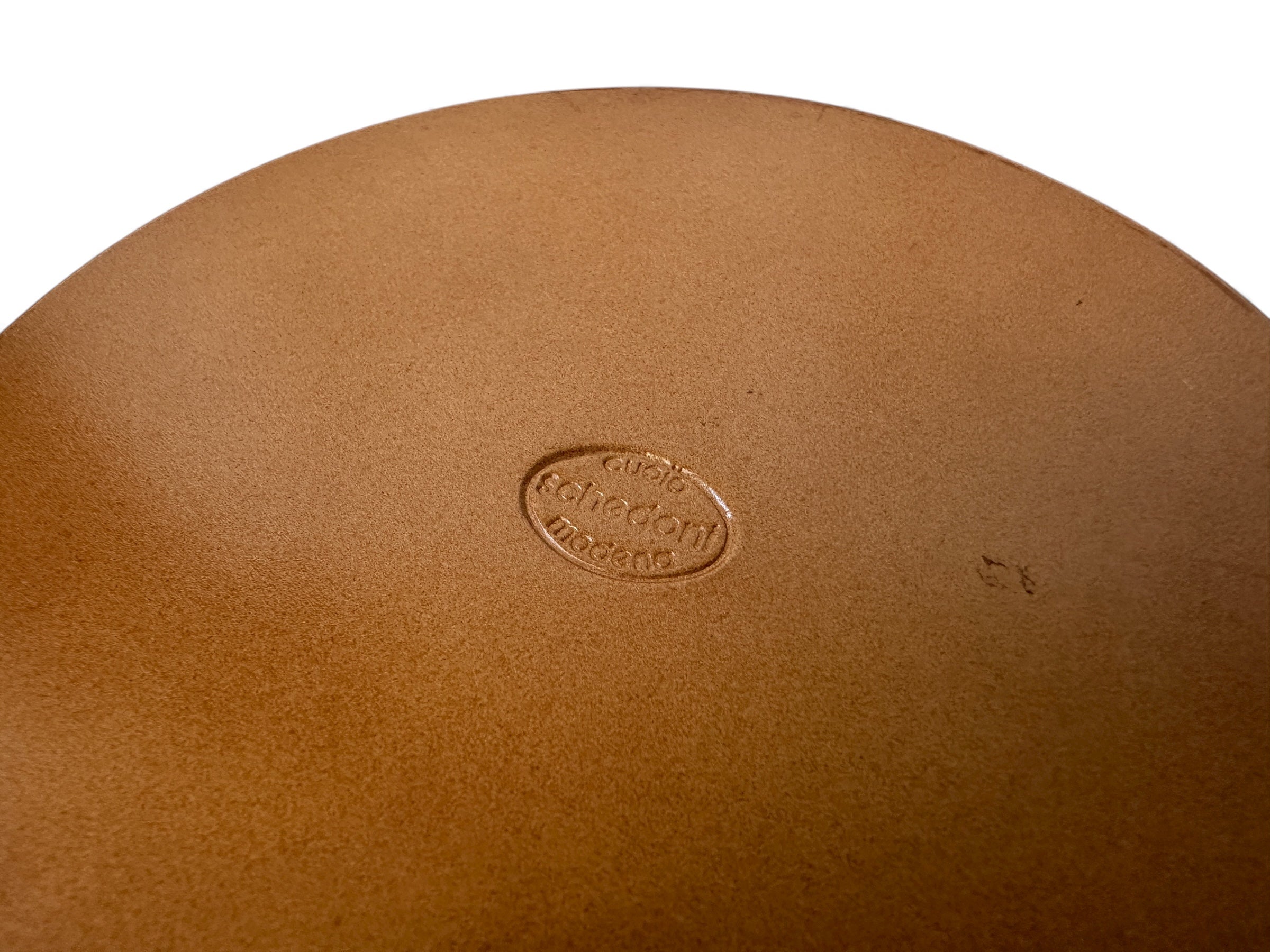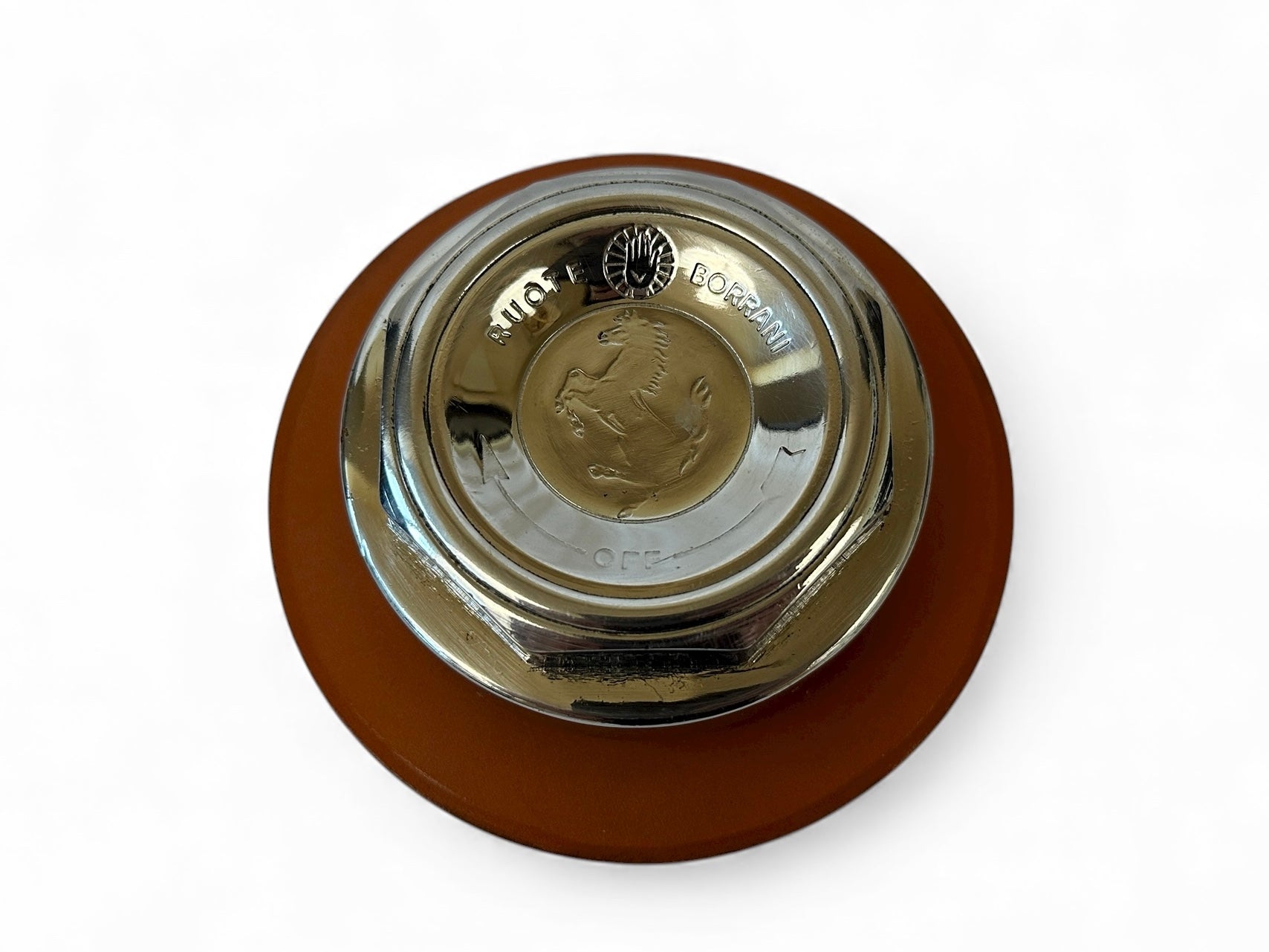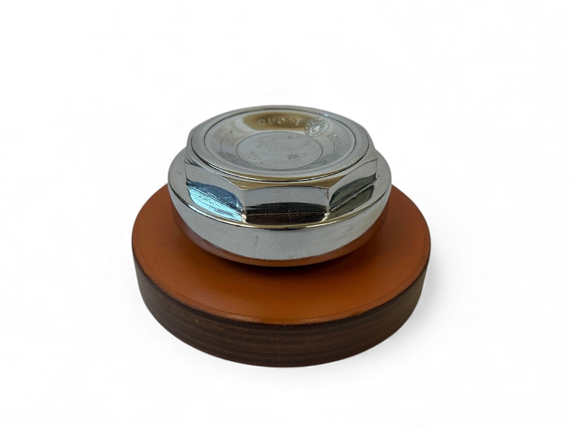 Original Ferrari Borrani wheel nut knock off presented on a Schedoni leather base. This finely detailed piece combines authentic Ferrari heritage with Schedoni’s renowned leather craftsmanship. As originally used on classic Ferrari models, it now serves as an elegant decorative item or distinctive paperweight.