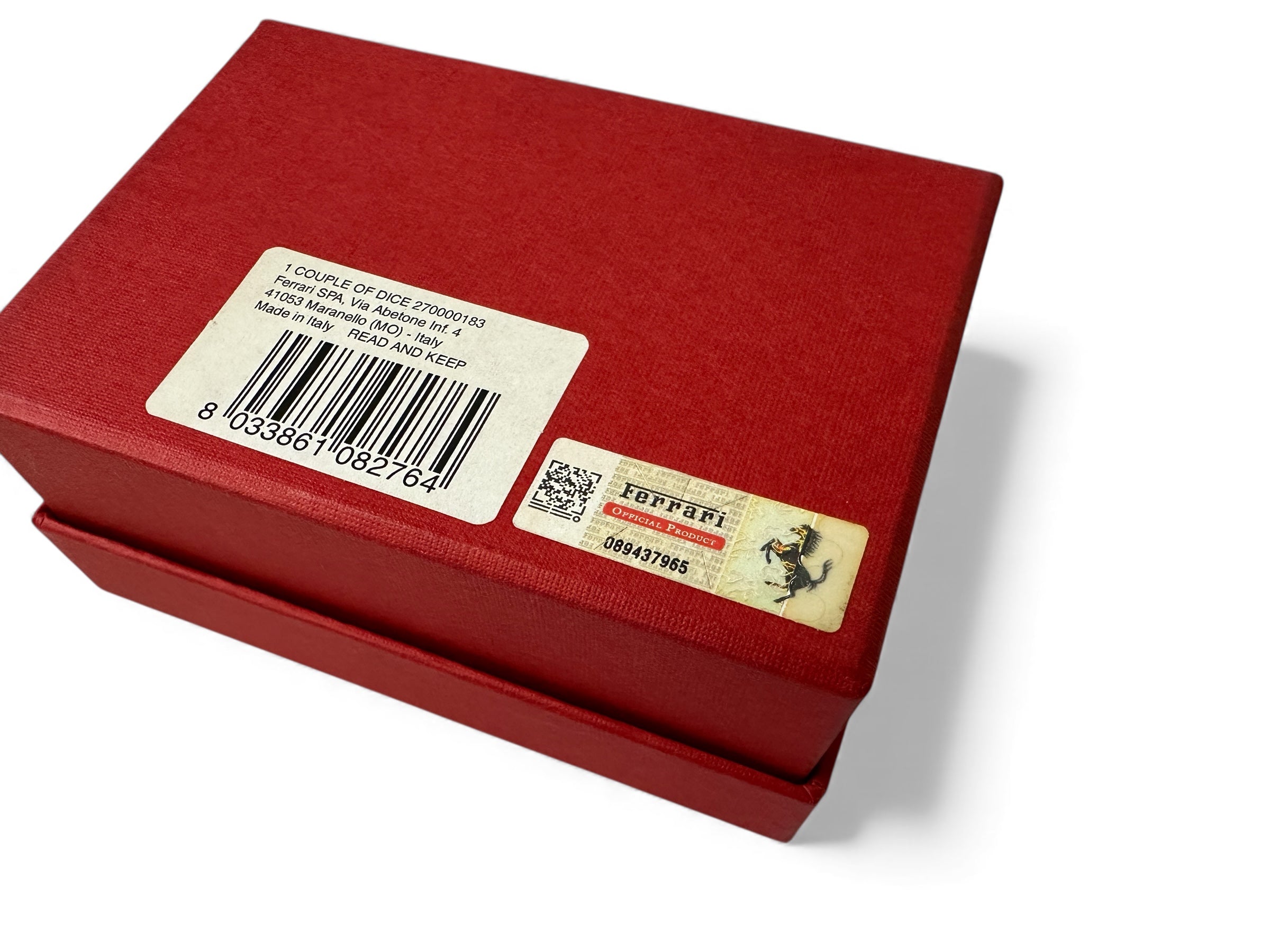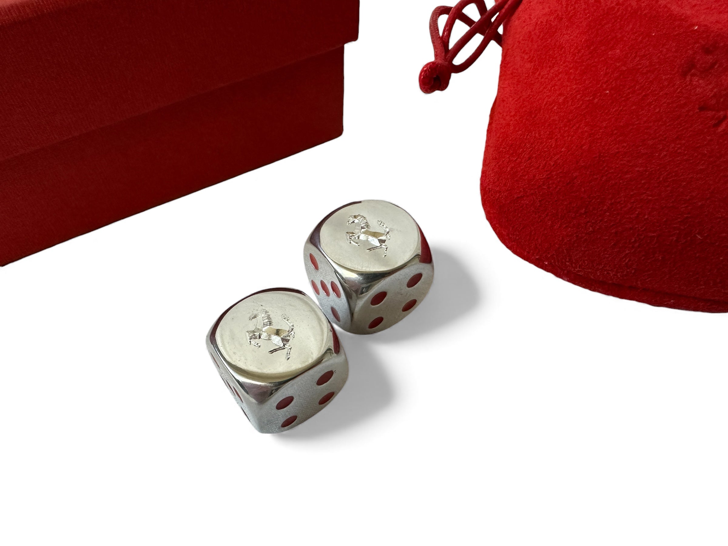 Official Ferrari dice set presented in its original storage bag. This very rare accessory features two dice, each engraved with the Prancing Horse logo. Made in Italy, the set reflects Ferrari’s attention to detail and distinctive design.