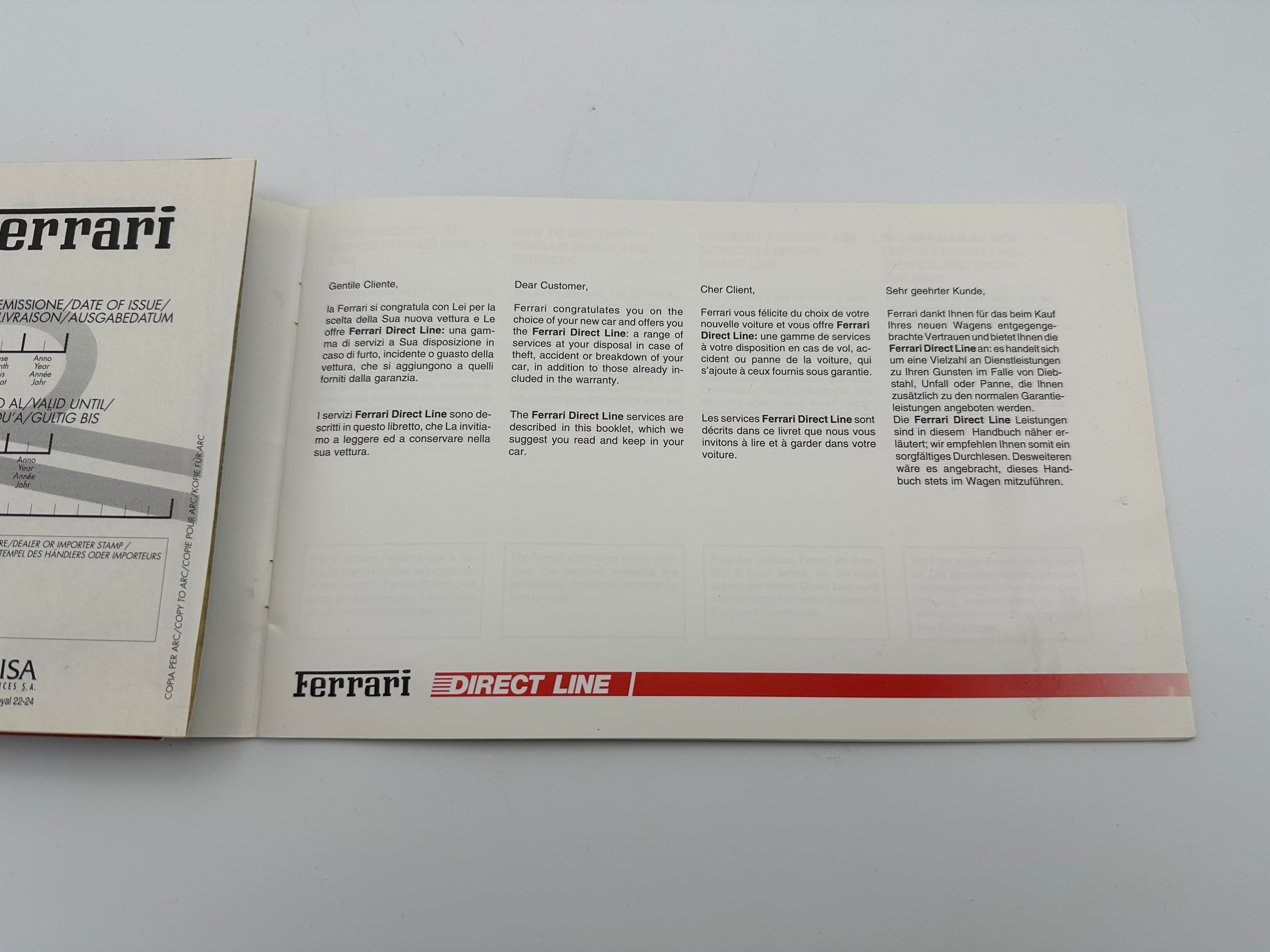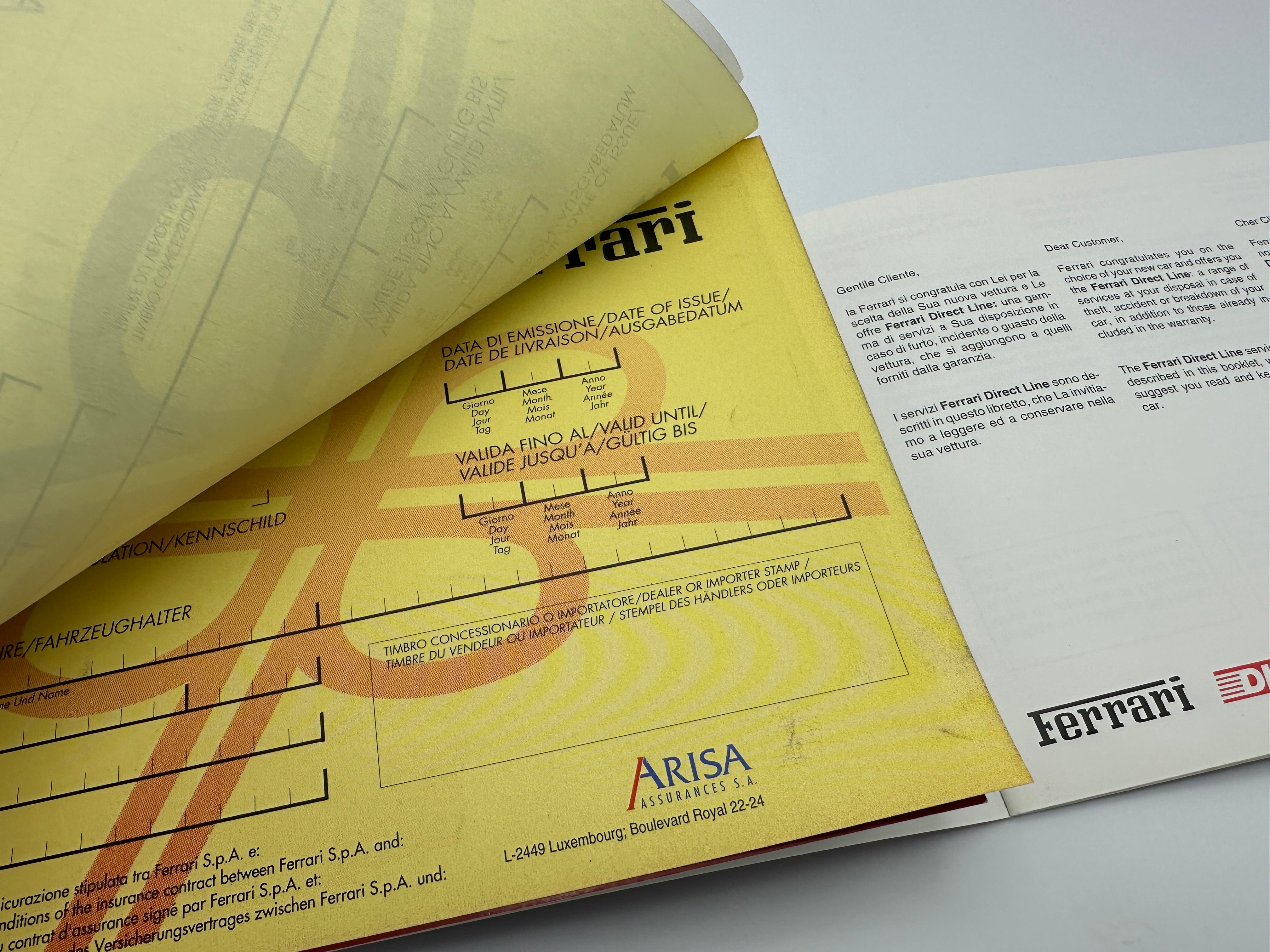 This Ferrari Direct Line Warranty and International Certificate of Assistance, print number #0149/99, is an original document from 1999. It is in blank condition, with no entries filled in. Issued as part of Ferrari’s warranty service, this certificate was designed to offer international assistance to Ferrari owners, ensuring support across different countries.