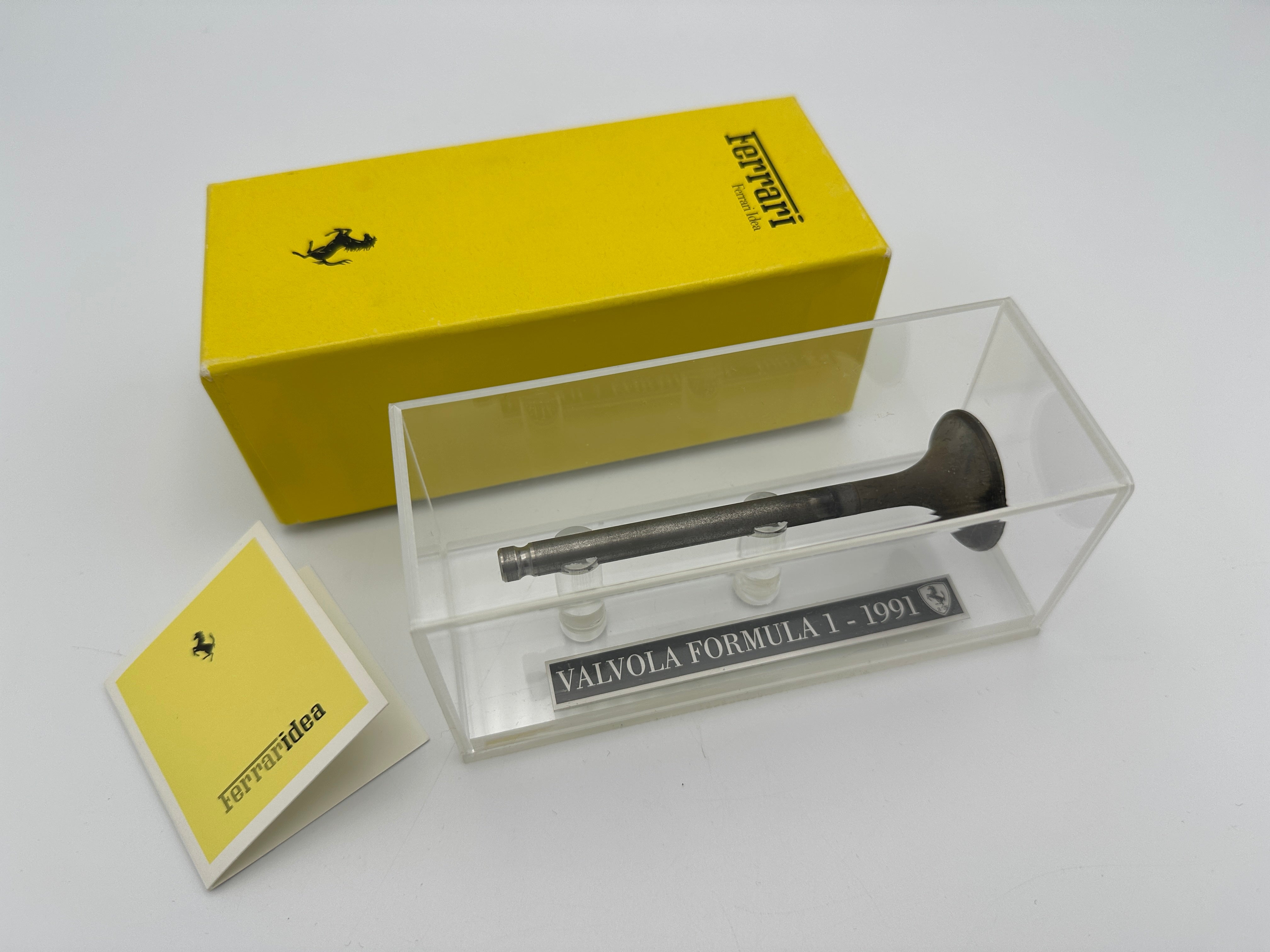 This original Ferrari Formula 1 valve from 1991 is a rare piece of motorsport history, presented in a protective display box. Manufactured for the official IDEA accessory range, it reflects the racing heritage of Ferrari during the early 1990s.