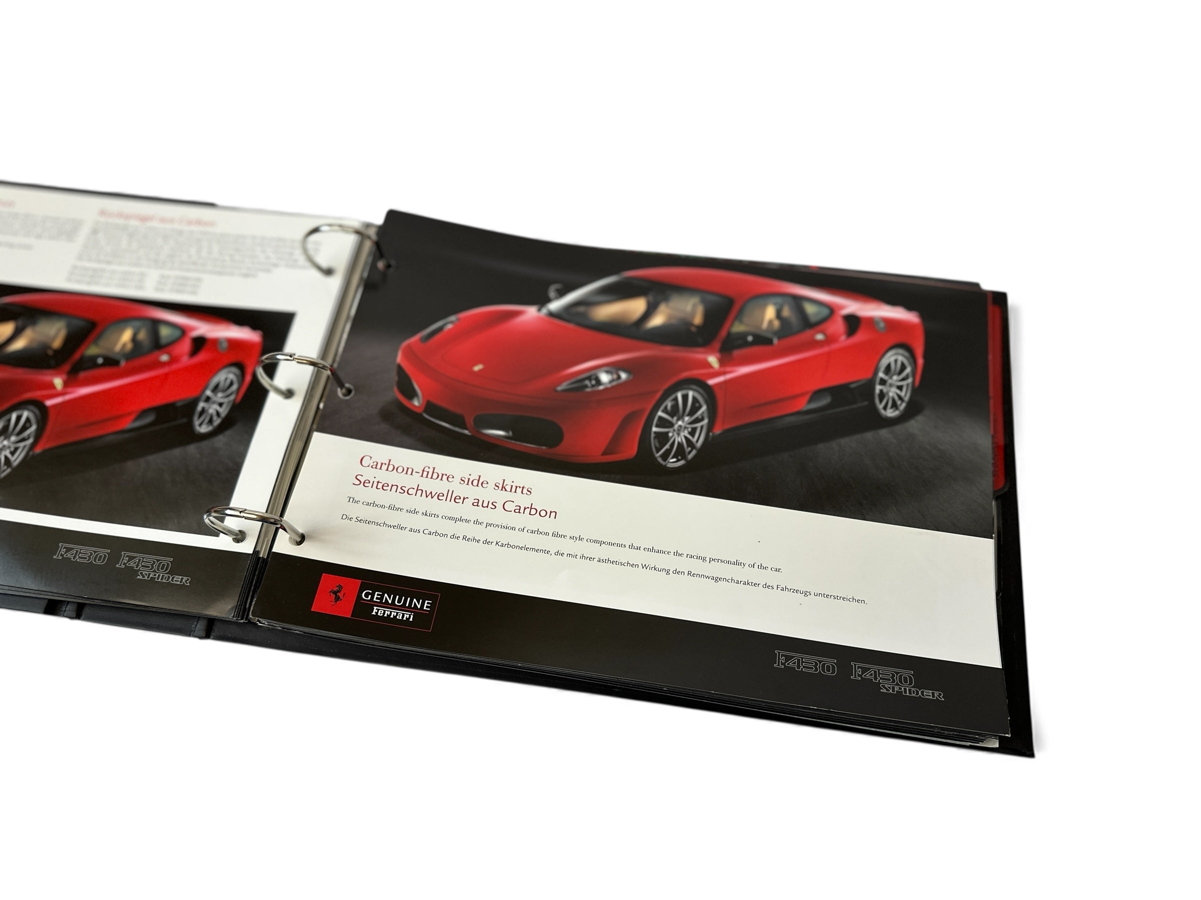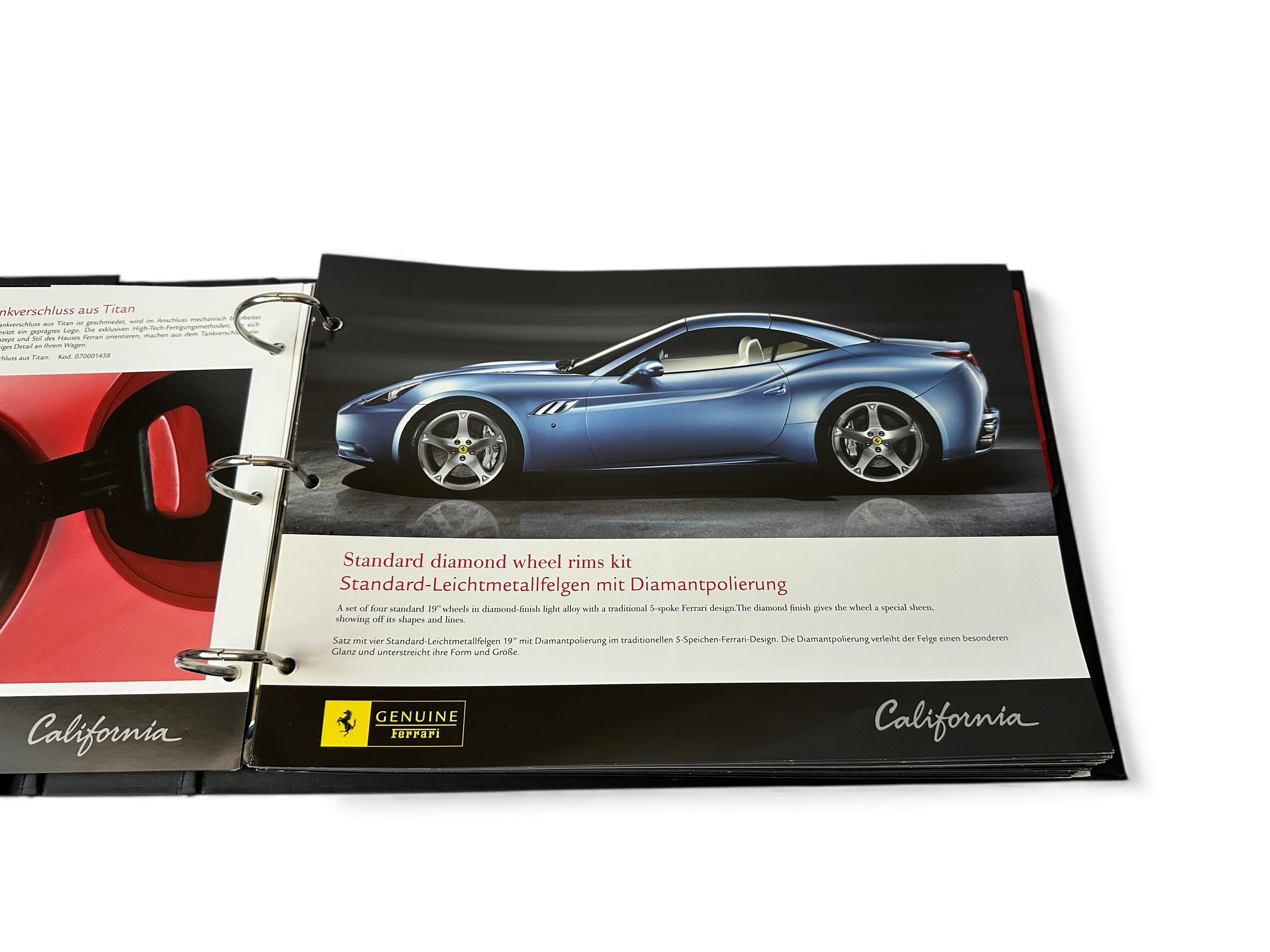 Original Ferrari genuine accessory catalogue issued exclusively for dealership use in approx. 2008/2009. This hardback edition features a carbon fiber cover with the Prancing Horse logo and presents the official accessory range for models including the California, 360 Modena/Spider, F430 and F430 Spider, 430 Scuderia, 575M, 612 Scaglietti, and 599 GTB.