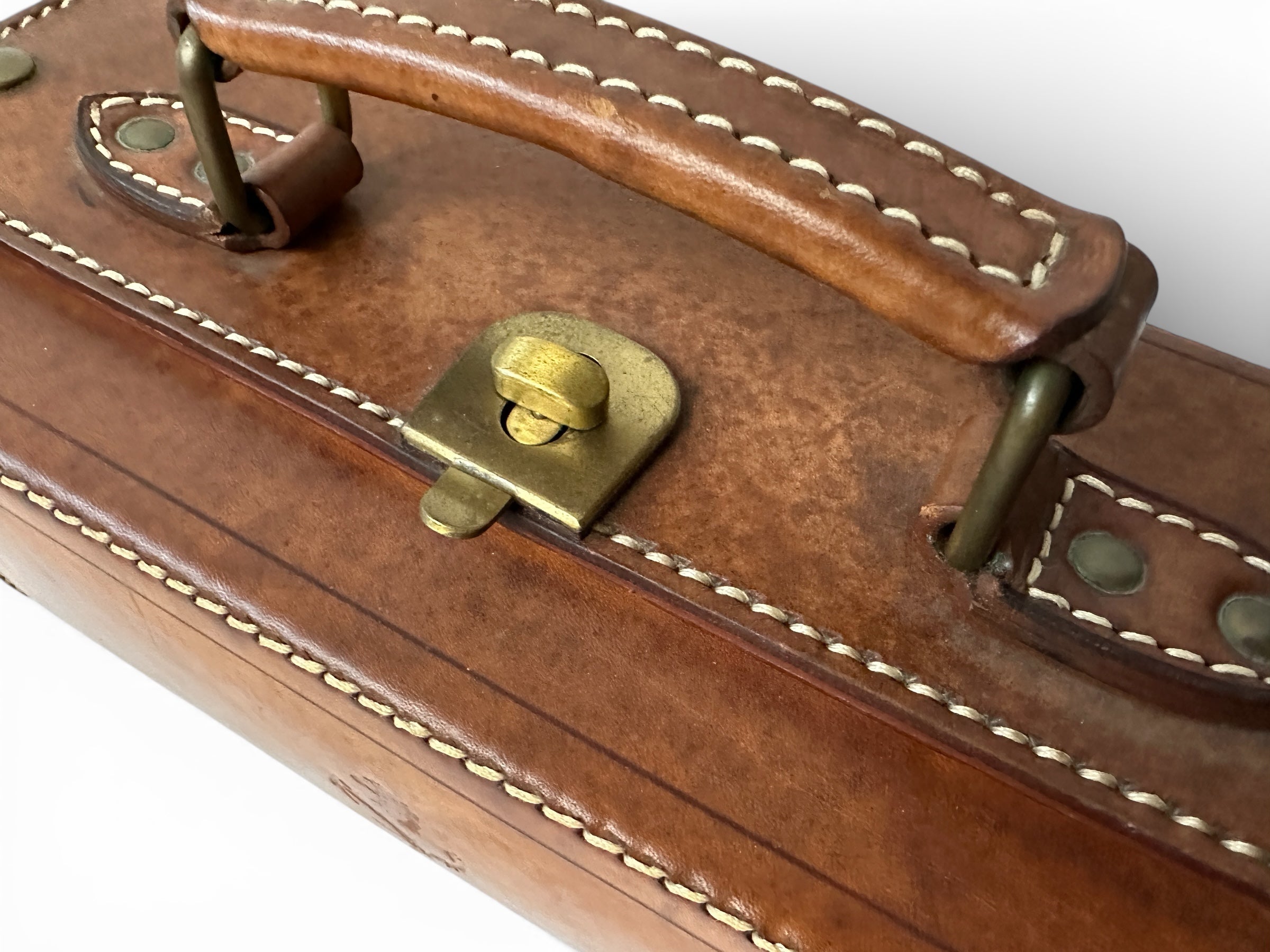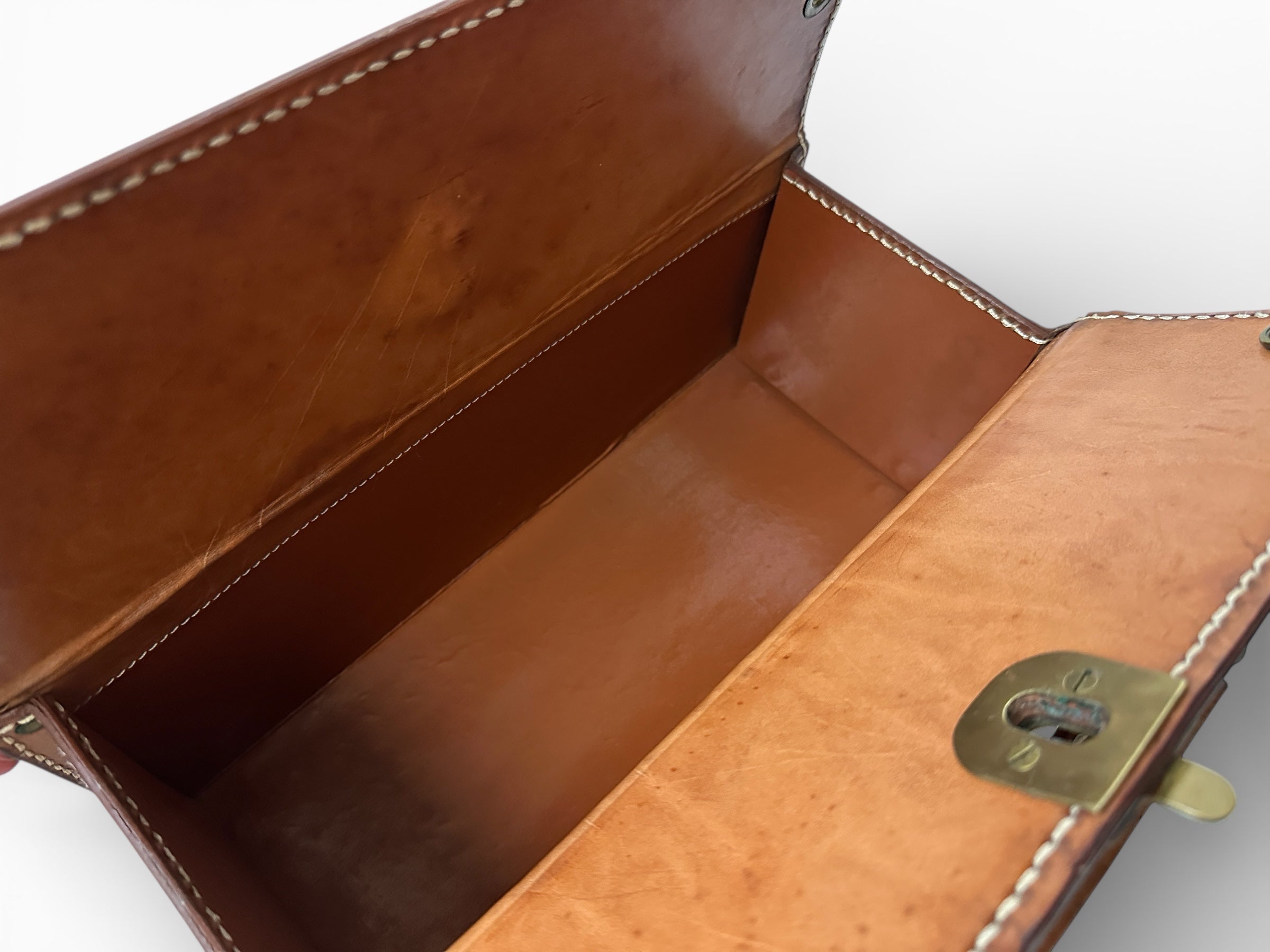 Used condition. The exterior leather shows overall traces of use and storage, consistent with age and original purpose.