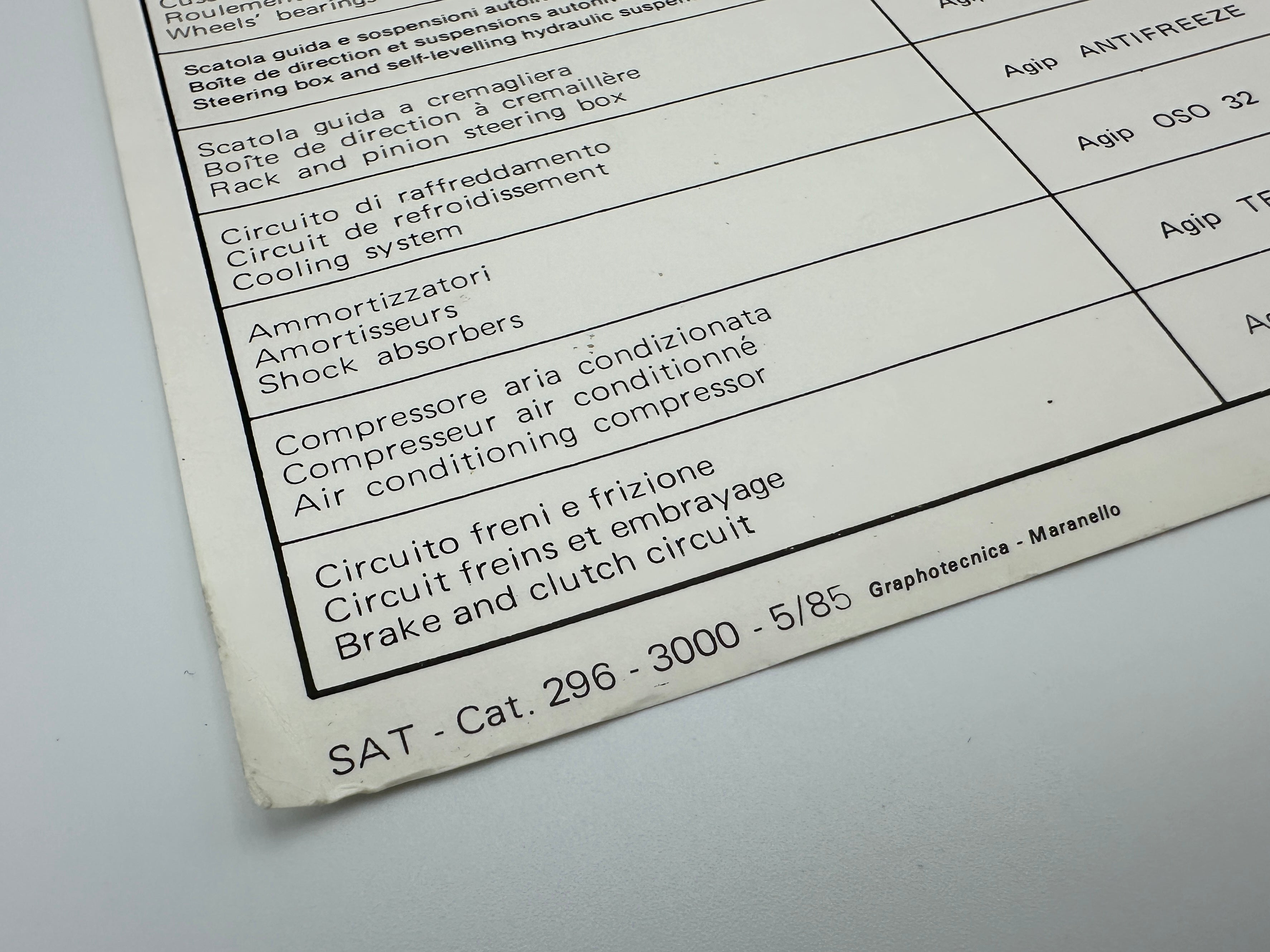 Ferrari Lubricants Chart and Lubricants Comparison Chart 1985 - 5/85