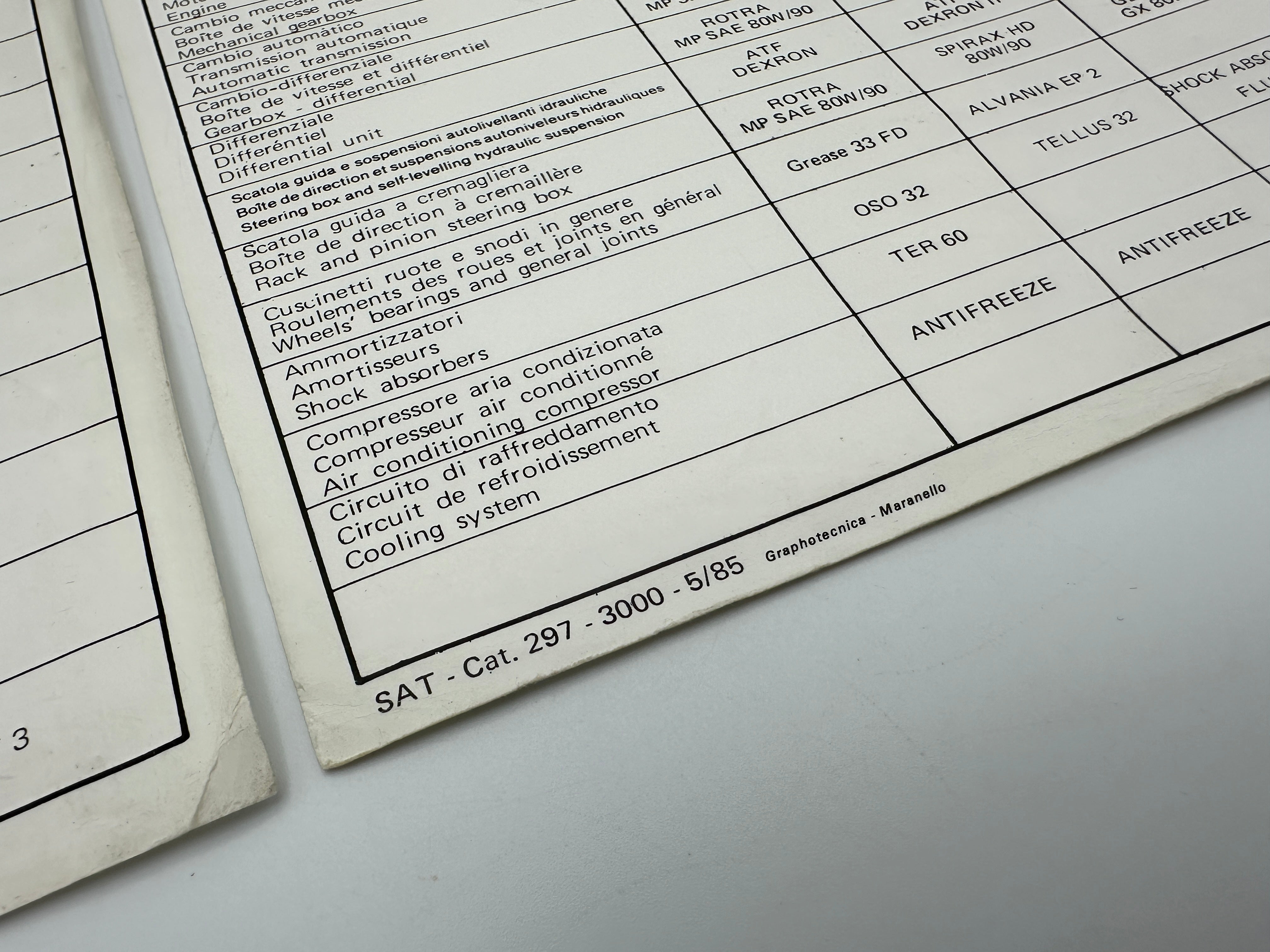 Original Ferrari lubricants chart and lubricants comparison chart issued in 1985. These charts provide official lubricant specifications for Ferrari models including the Testarossa and 288 GTO. Official print number 296 and 297 - 5/85