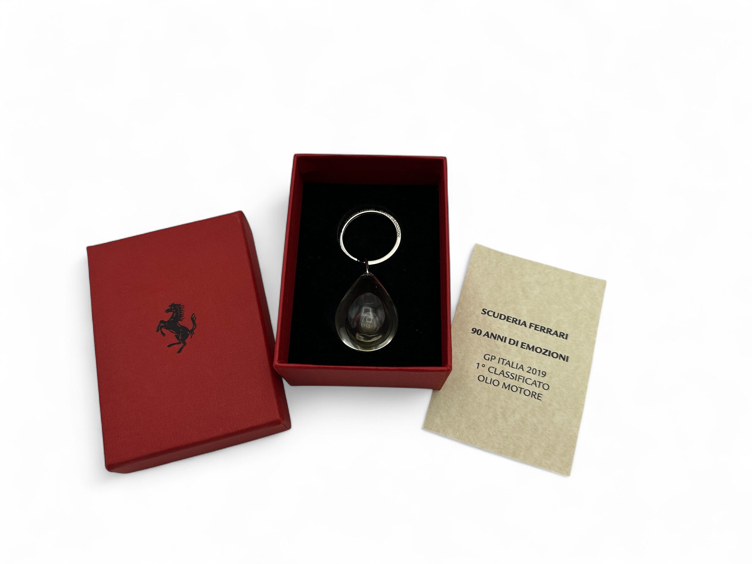 Official Ferrari keychain featuring an authentic drop of oil as used by Scuderia Ferrari during the 2019 Formula 1 Italian Grand Prix.