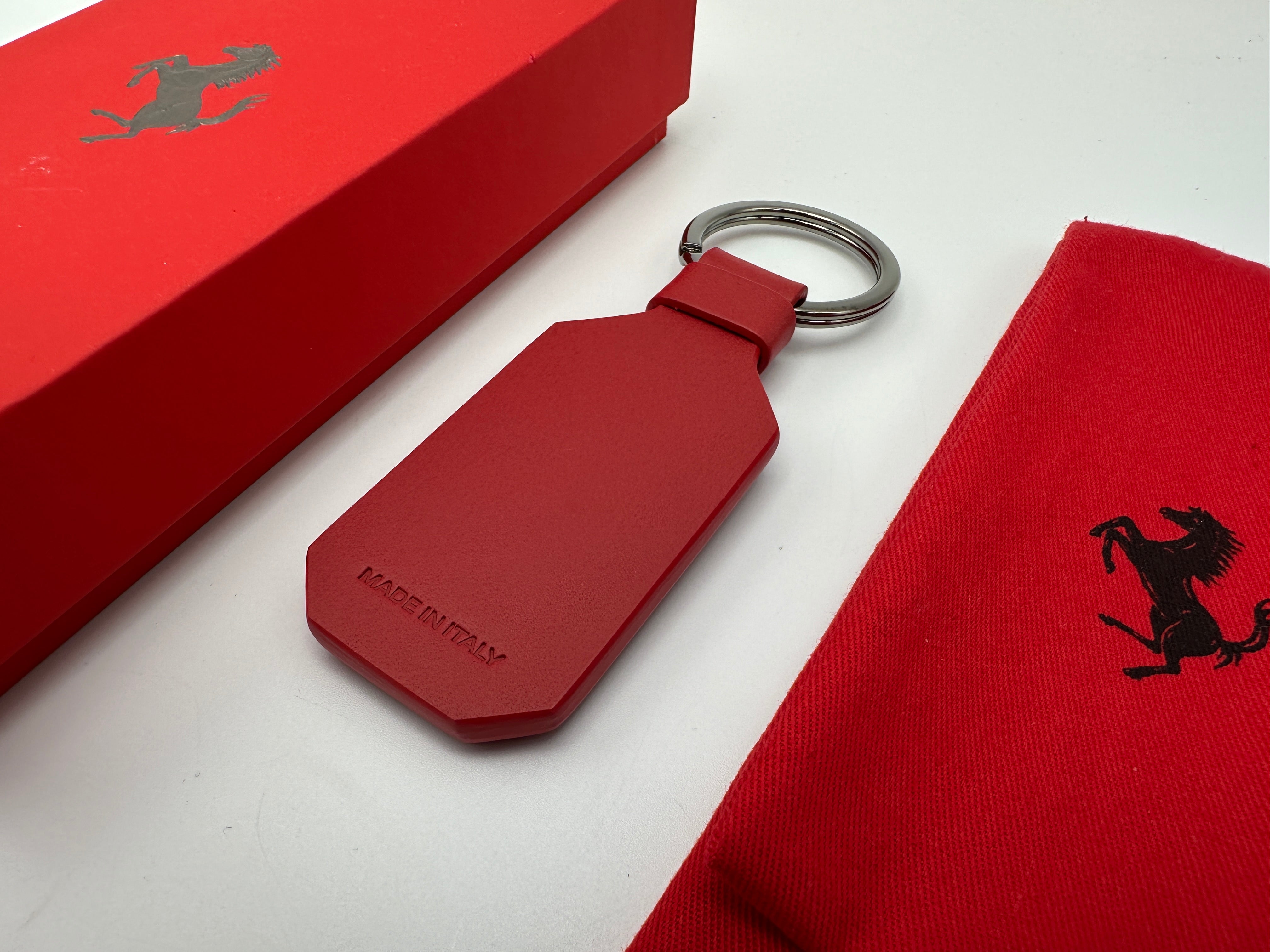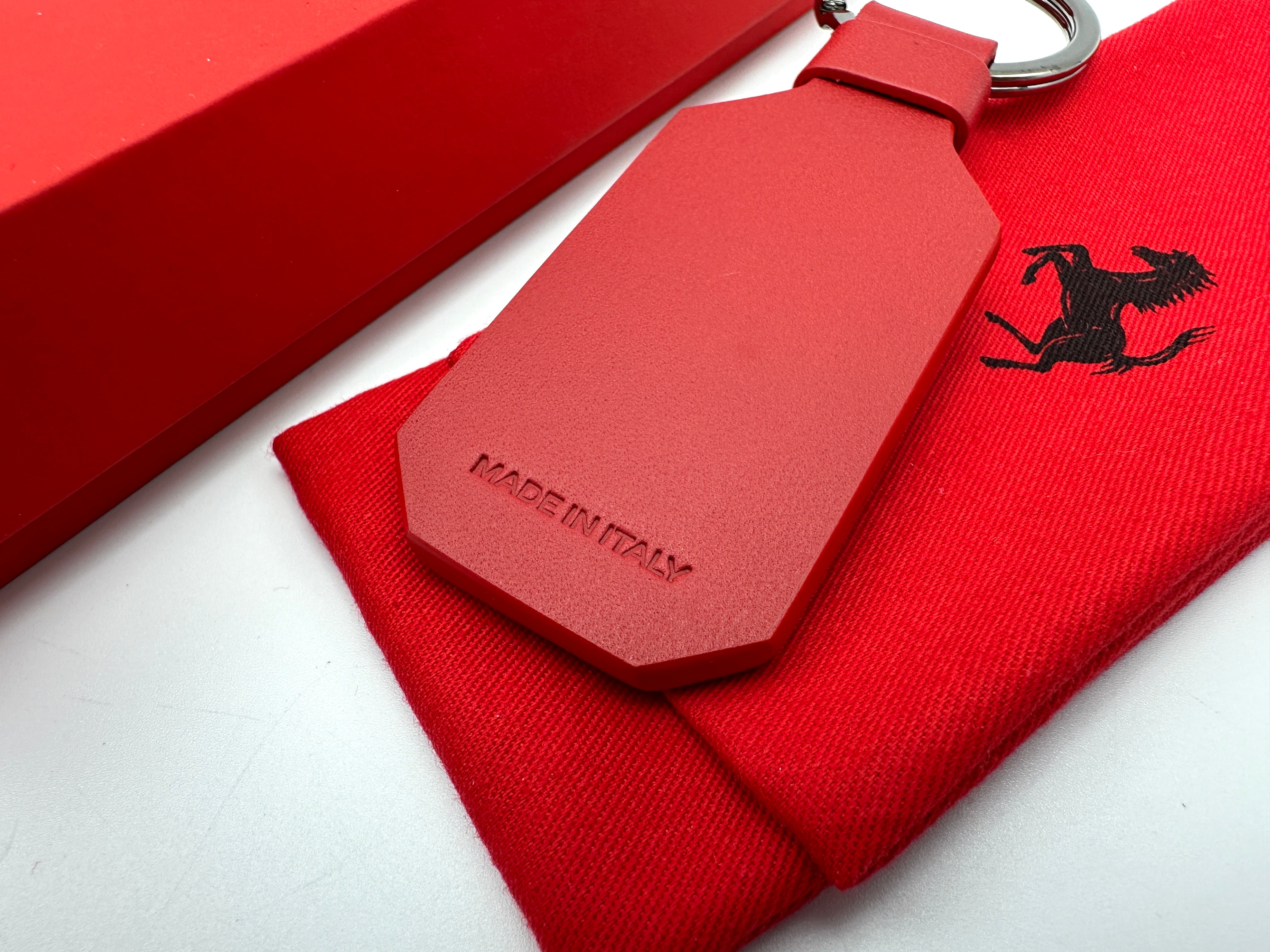 This official Ferrari keychain features red leather with refined red stitching, adorned with the iconic Prancing Horse emblem. A luxurious and practical accessory, it embodies Ferrari's style and craftsmanship. Comes in its original box with a protective pouch.