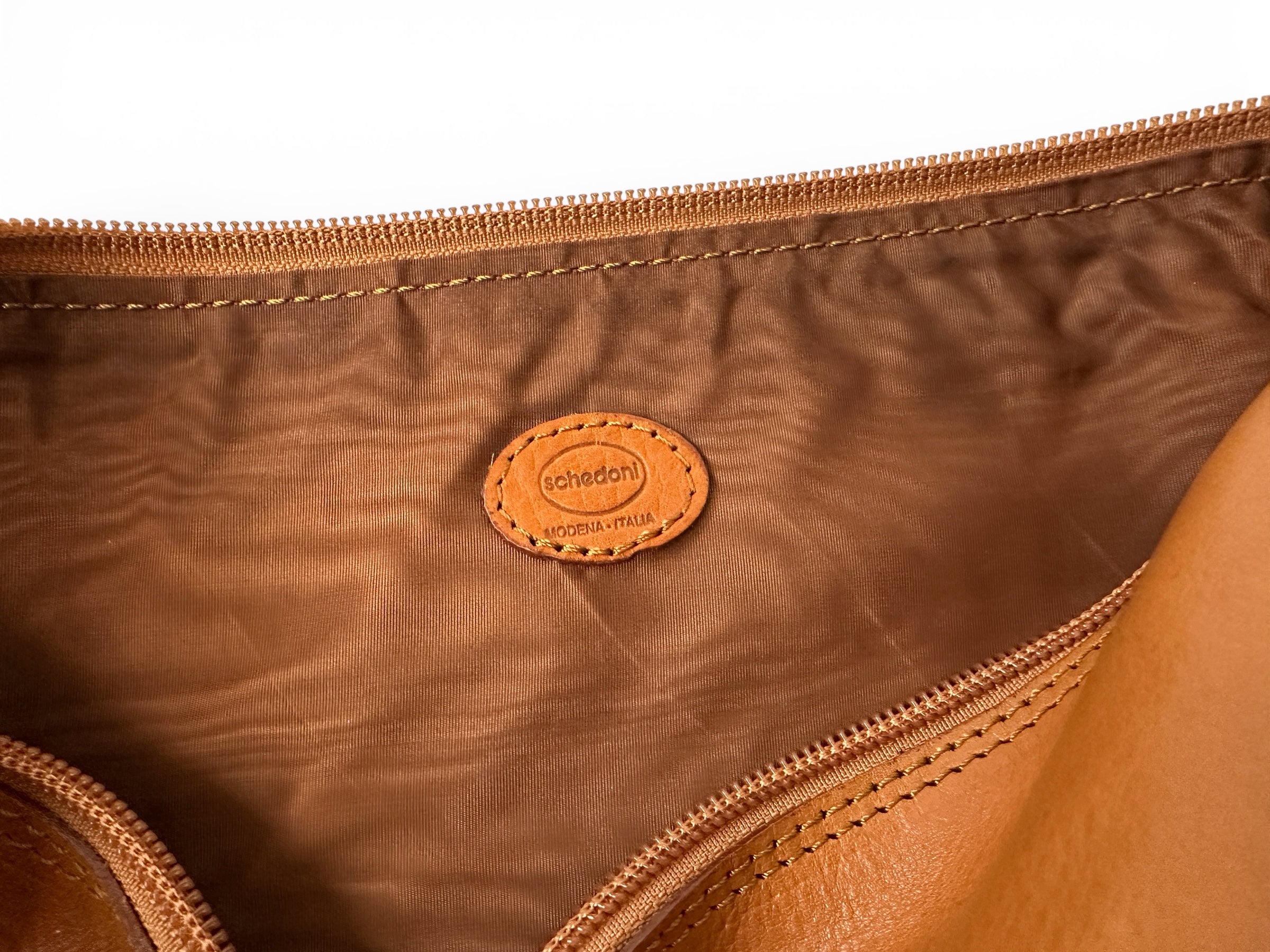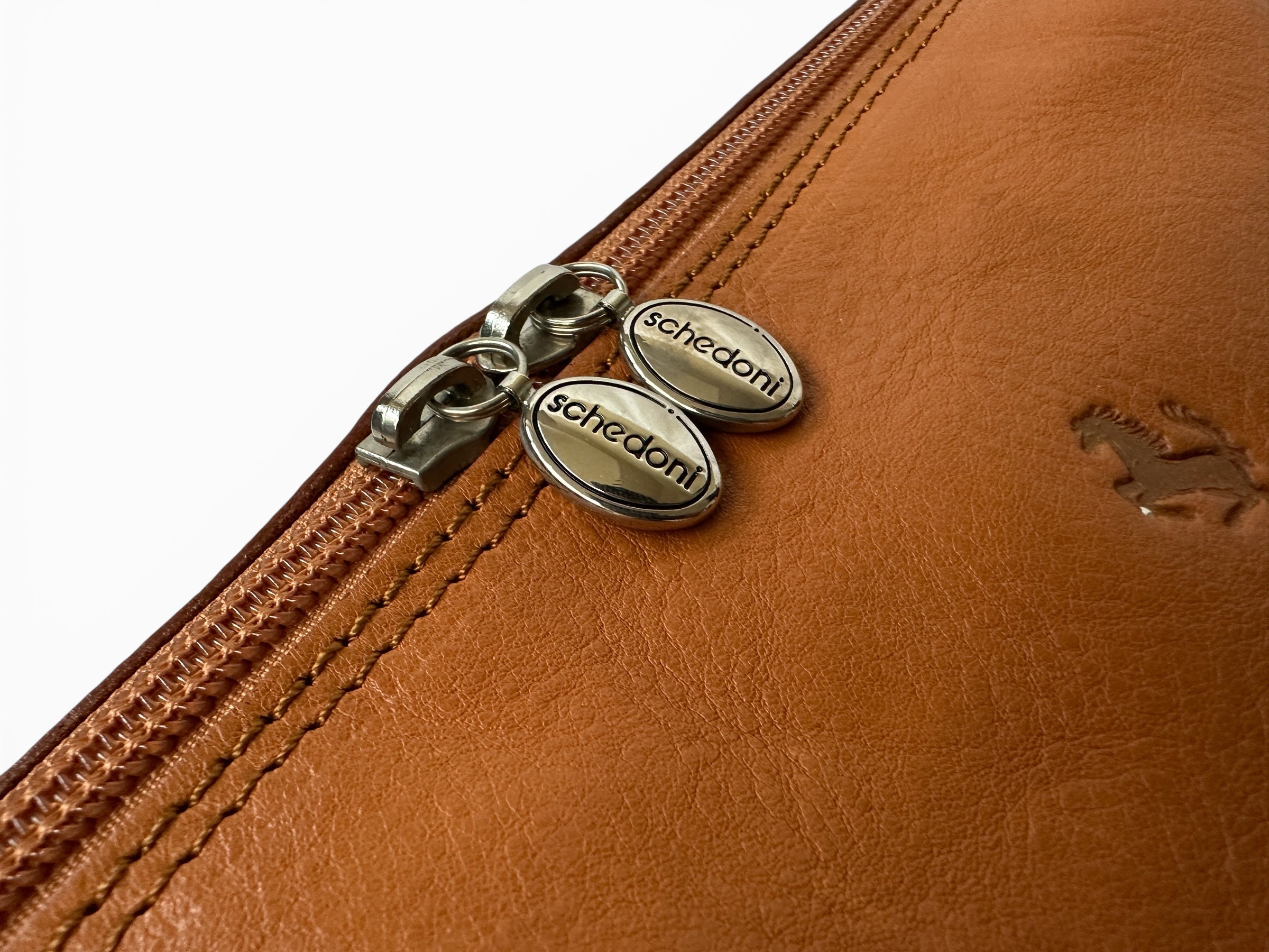 This Ferrari leather wash bag/personal care or vanity bag, was produced in Italy by Schedoni exclusively for Ferrari. Crafted from high-quality Cuoio leather, it reflects the traditional craftsmanship associated with Ferrari accessories supplied by Schedoni. The bag features a practical design intended for personal care items and travel use.