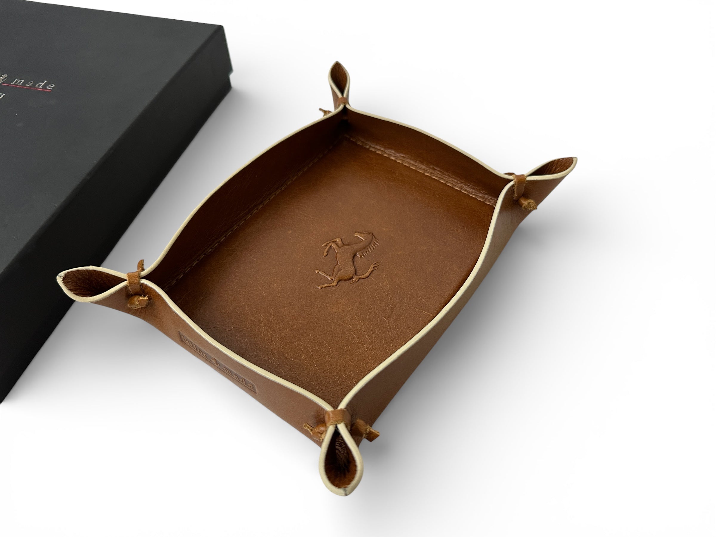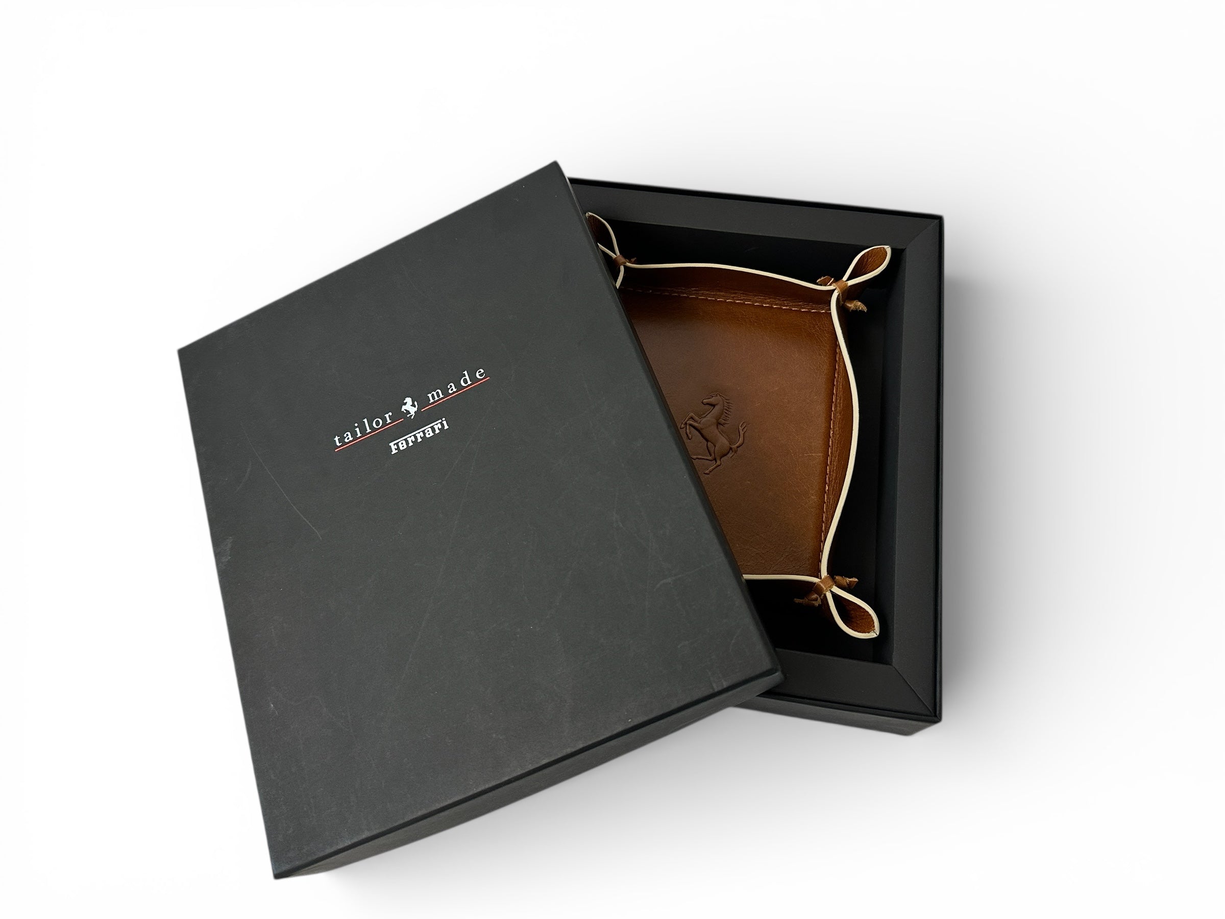 Original Ferrari leather tray produced exclusively for clients of the Tailor Made customization program. Crafted from high-quality leather and detailed with the Ferrari prancing horse logo, it reflects the refined materials and craftsmanship associated with this bespoke program. The tray is suitable for holding small personal items and accessories. It comes complete with its original presentation box.