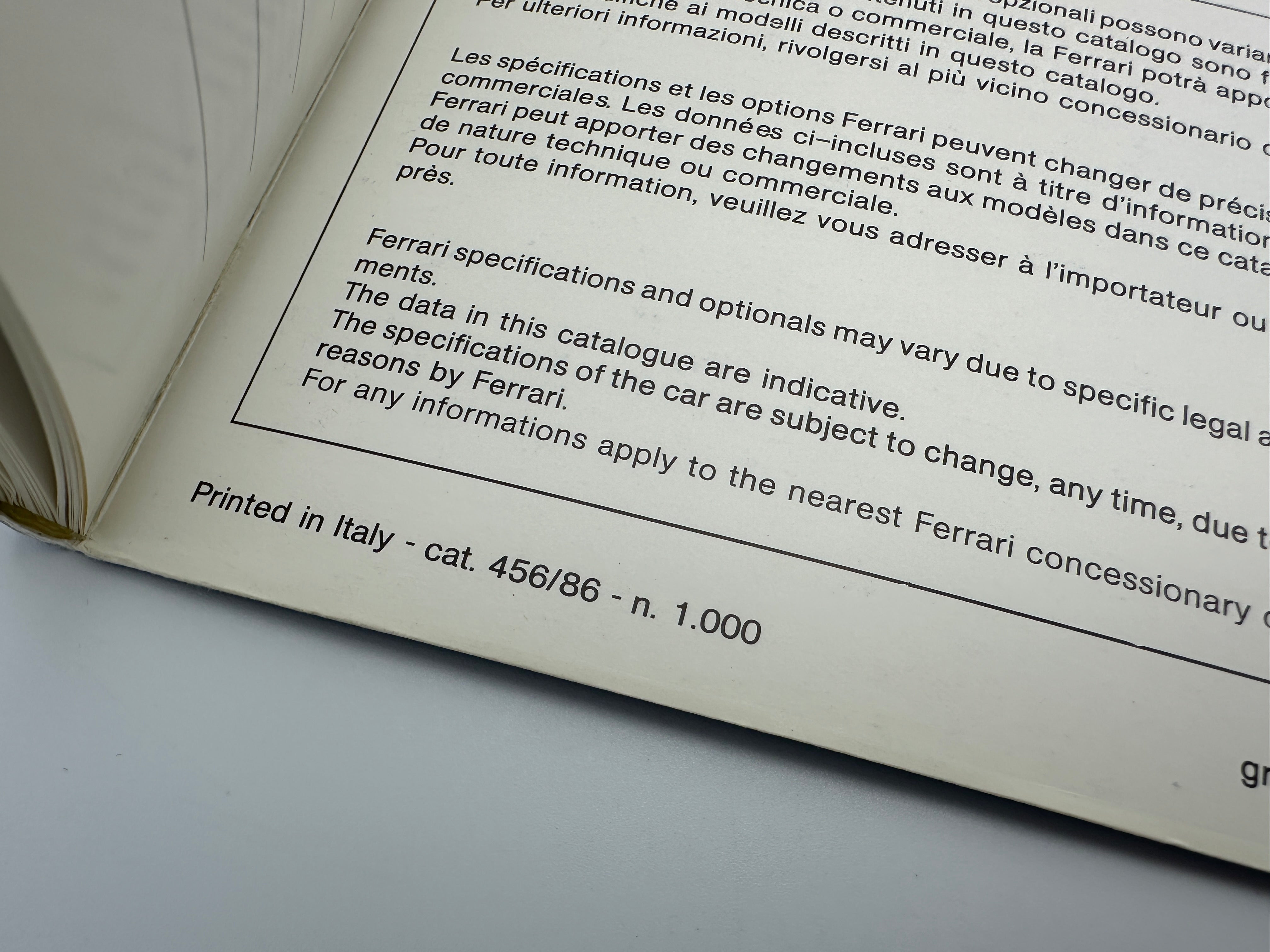 Original Ferrari Testarossa owner’s manual from 1986, print number #456/86, issued by Grafiche Rebecchi.