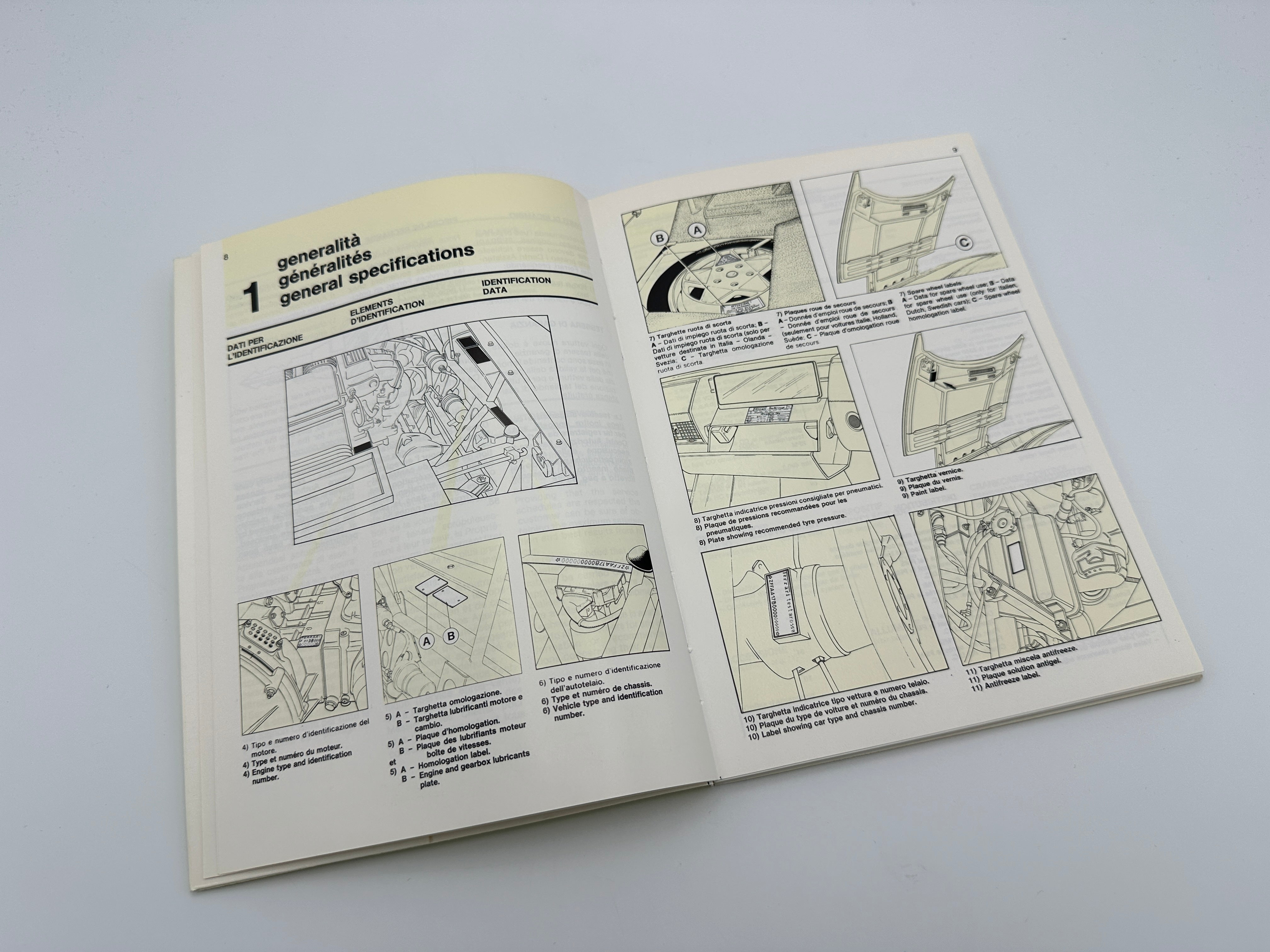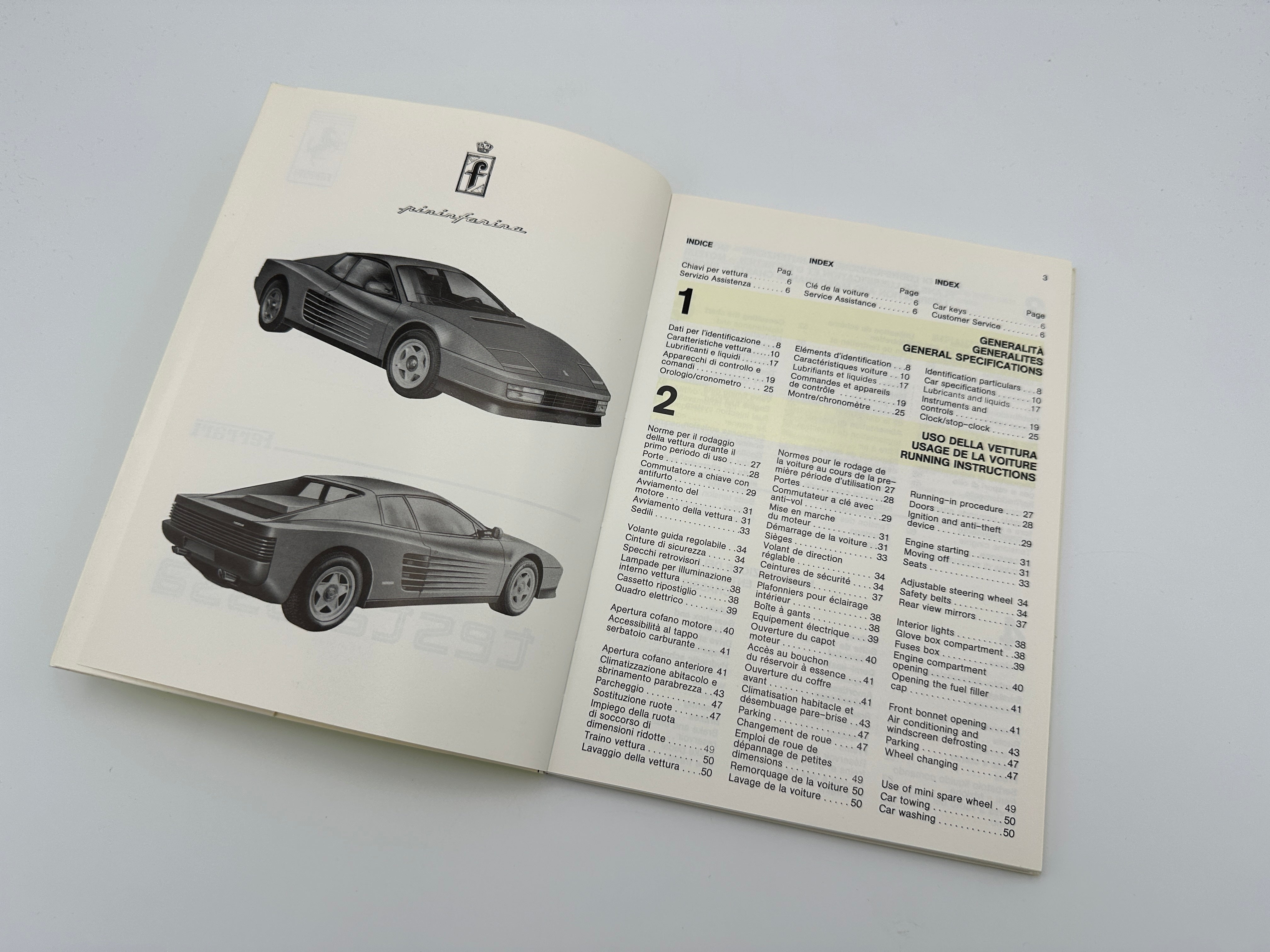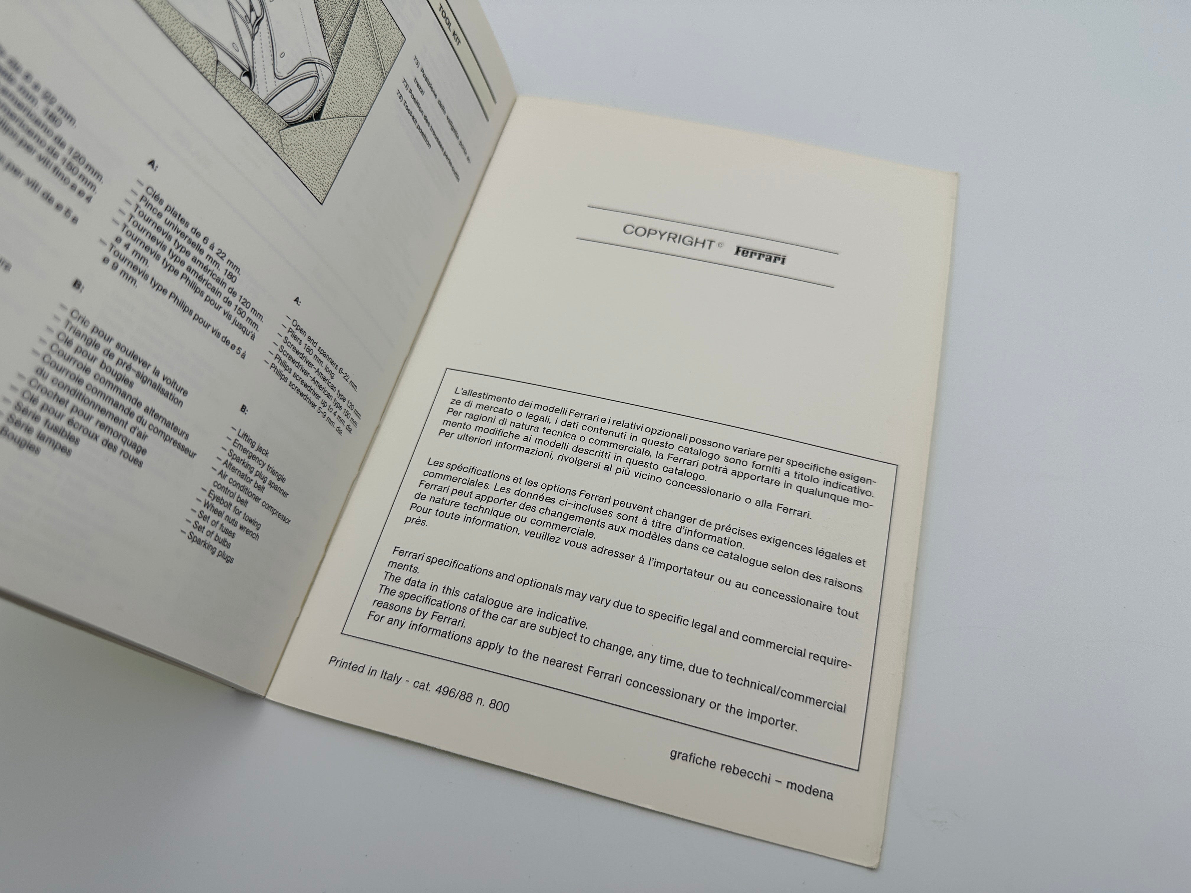 Original Ferrari Testarossa owner’s manual from 1988, print number #496/88, issued by Grafiche Rebecchi.