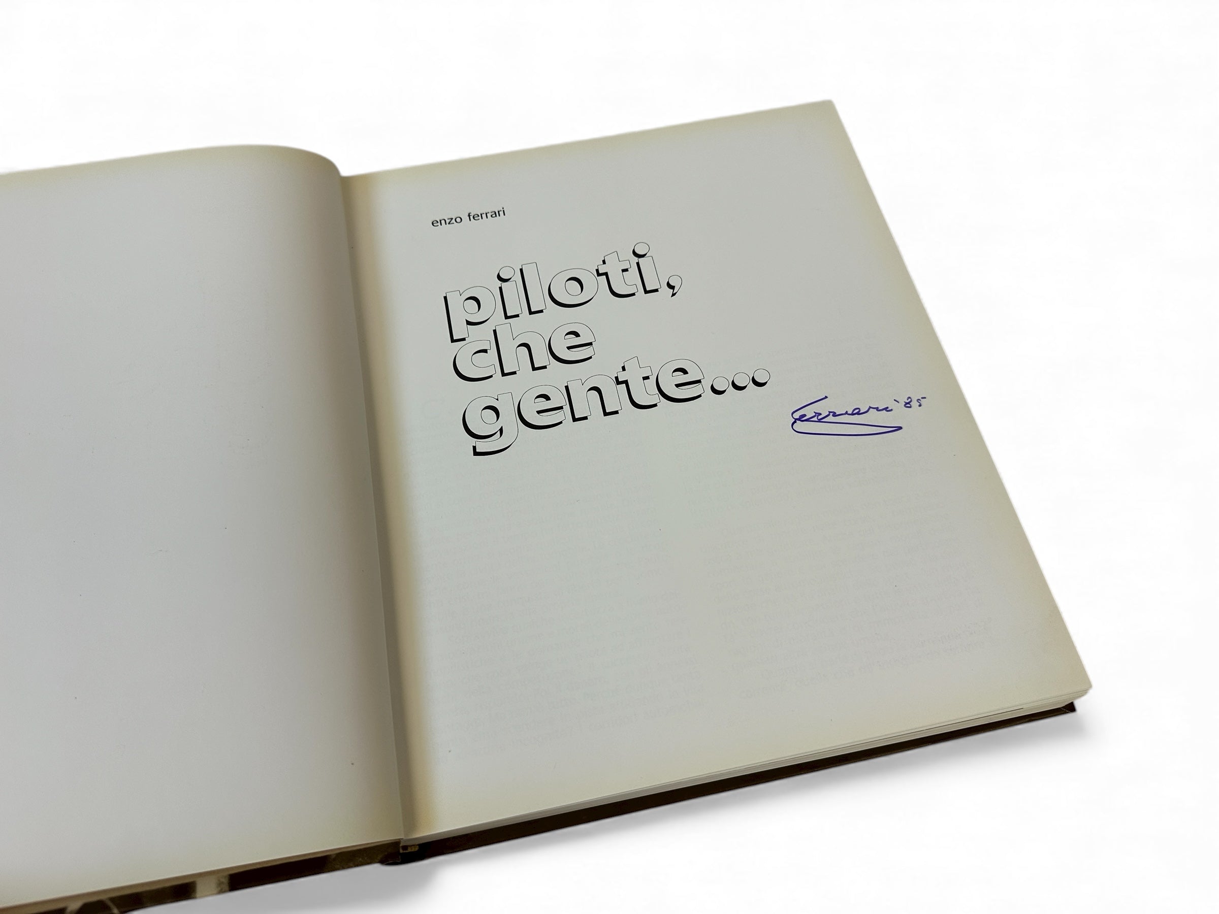Piloti, Che Gente — book written by Enzo Ferrari and published in 1983. This limited first edition, restricted to 2,500 copies, is hand-signed by Enzo Ferrari in 1985 and was presented exclusively to his closest associates. Written in Italian, it contains Ferrari’s personal reflections, historical accounts, and tributes to the great drivers who shaped the marque’s racing legacy.